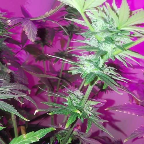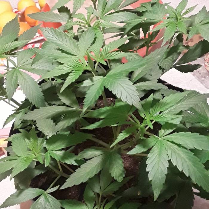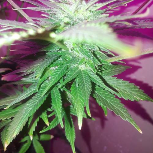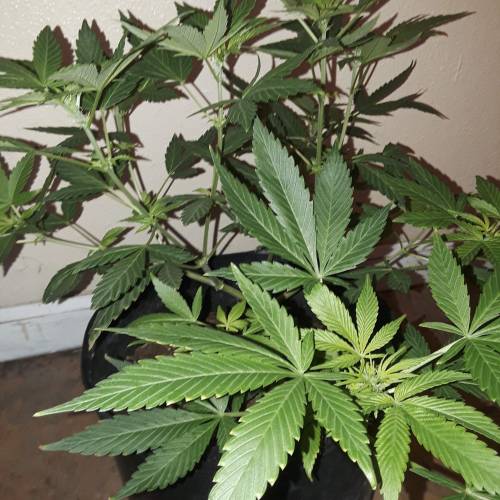 MUHTAVATION Day 45 of flower it's been growing pretty slow but since all I had was a 50w light i wasn't expecting much though i knew i should of upgraded during flower stage.the leaves started turning yellow and brown but thankfully I move farther from light.still not sure what type of strain it is doesnt smell much but looks a hybrid to me.
