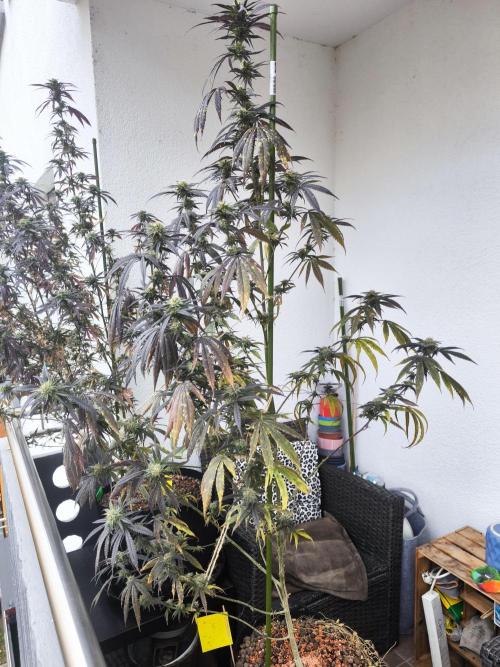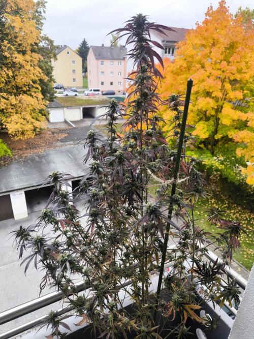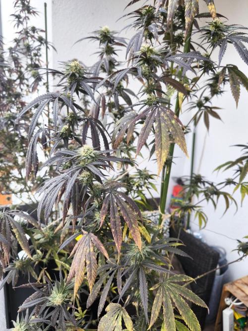 BalconyBoy 15.09.25 the summer is definitely over and autumn brings its mix of sunny days while the sun is out and cloudy, windy, rainy days. The plants still hold up well. They continue to drop leaves and will look like nothing but budsites on sticks soon enough. The budsites still gain volume and stickyness now that the second top dressing of fertilizer is kicking in with a week of delay as usual (organic). Fingers crossed the notorious mildew is gone and done. For the last few weeks I don't have much more to do other than enjoy the smell on my hands after plucking a few yellow leaves and continue watering at a reduced rate. 300ml per day is enough to keep the girls happy.