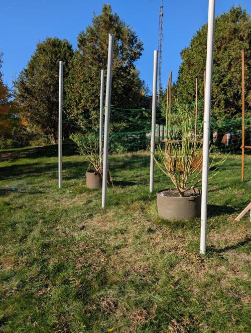 Grow_for_Happiness Me last week: I'm going to let these go natural and try not to trellis. Me after finding two branches broken 95% off the plant "time to MacGyver a trellis!!". So MacGyver I did and riffed up what is now my favorite way to trellis outdoors. Pipes are drainage pipes I had laying around, slid over stakes made out of scrap 2x2 that were three feet long, with half above and half below ground. Two screws into each to secure, slide the netting over and we're done! A little more precise measuring at the start, but nothing too difficult. Was a hot week above 40°C with humidity again, so watering daily but plants loving it just drinking their faces off.