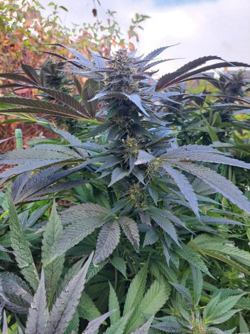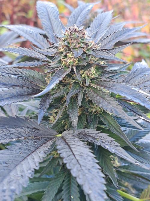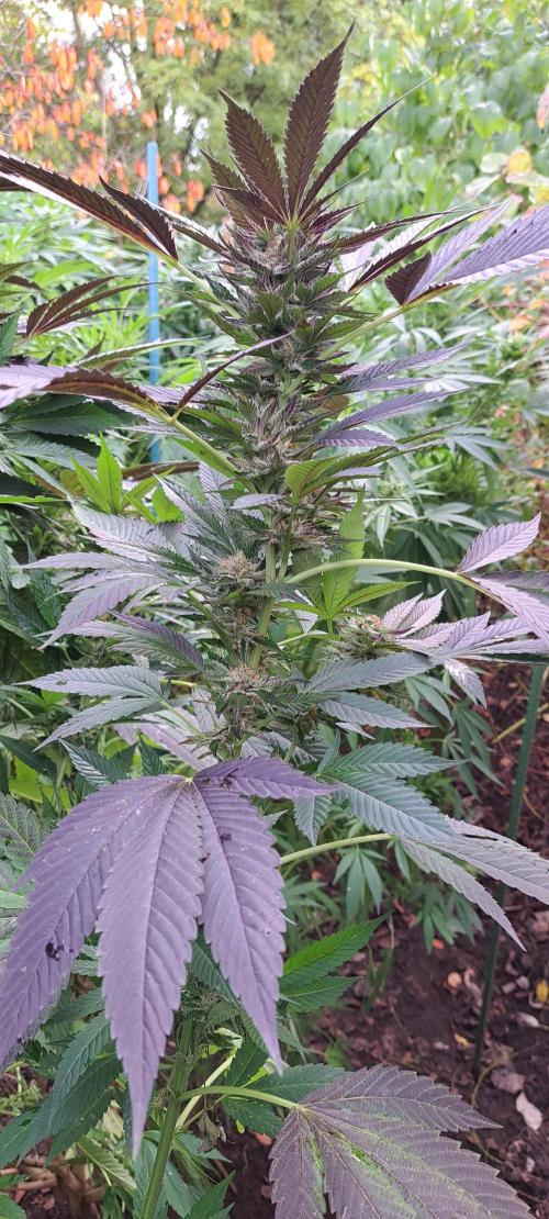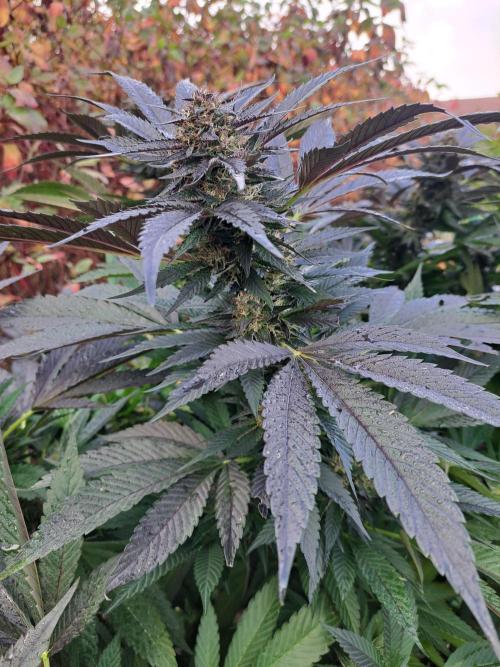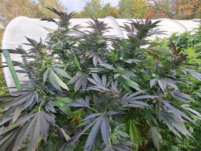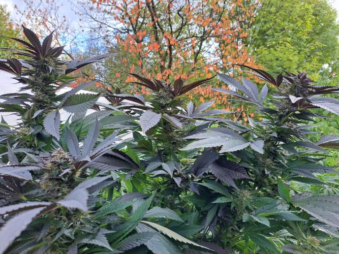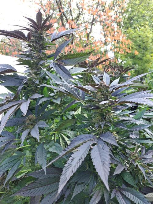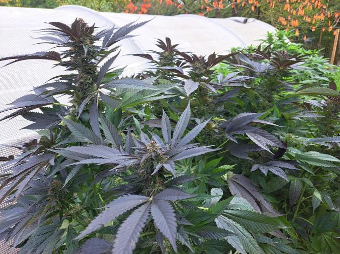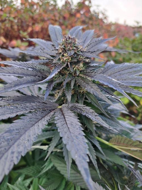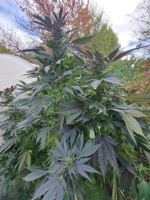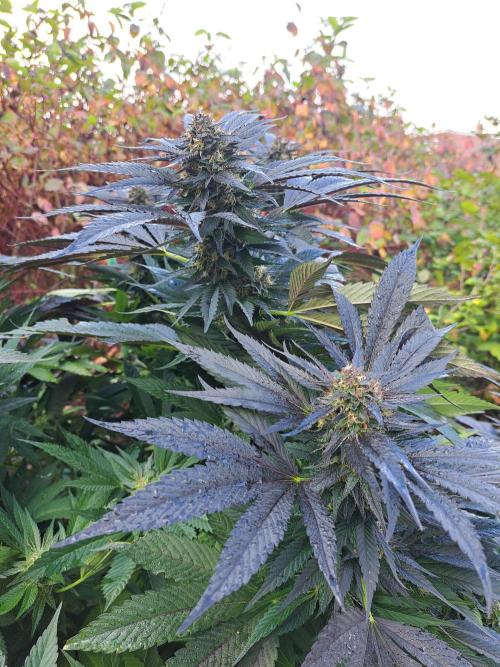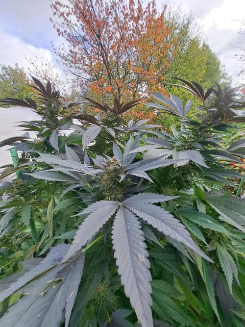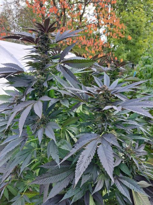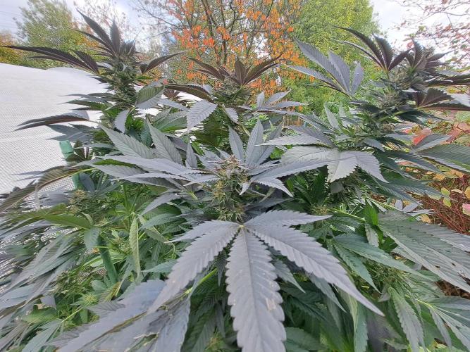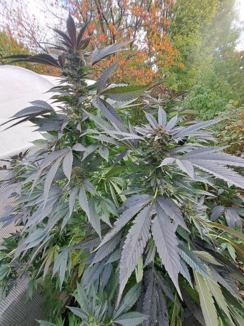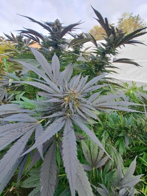 Oyziphar The day length has dropped to 11 hours ⏰⏰⏰ This week we had a storm ⛈️ and cloudy week with lots of rain 🌧️ Some of my outdoor plants were heavily damaged, but the Cookies Gelato has weathered the storm very well 😛😛😛 Next year, I'll have to put more support to the branches 😵 The Cookies Gelato outdoor in full ground is making big buds and is ripening as well. Very promising pheno for outdoor use. She's also going purple 💜💜💜 The Liberty Haze in the greenhouse has a lot of small buds, and they still need a lot of time before harvesting. I defoliated the Liberty Haze