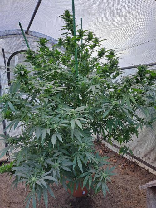 Oyziphar The day length has dropped to 12,5 hours ⏰⏰⏰ 👉 One Cookies Gelato plant outdoor in the open ground 🌞🌧️🌈. No manual watering. 👉 Two Liberty Haze plants in 24 liter containers. Daily watering. 🌡️ Temperatures were a bit low this week and lots of rain and wind 🌧️ 📢 I moved the Liberty Haze plants 🗽 outside the greenhouse 🏞️, because the chickens 🐔 take dustbaths in the greenhouse, creating a lot of dust on the buds. 💭 But outside - because the plants were too large - they fell due to the wind 💨. That is why I dug two holes 🕳️ in the ground and I placed the plants with their pots 🌲 in these holes, so they no longer fall