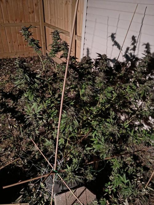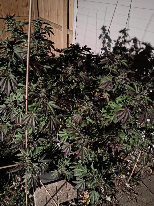 CWolcott1991 09/21 Got hit hard with a storm last night had em knocked over a couple times had to pen em against the garage to keep em up. They are definitely leaning and looking beat up one top branch broke off big pot. The smell is loud this morning though not both the small pot just smells green to me and not really terpy the big pot though at several feet away u can smell a sour milk kinda funk and as u get closer it gets sweeter and on a nug rub it's super sour and candy funk love it. I'm buying bamboo today to build support around em to finish the season strong hopefully went ahead and fed em both 1150ppm.