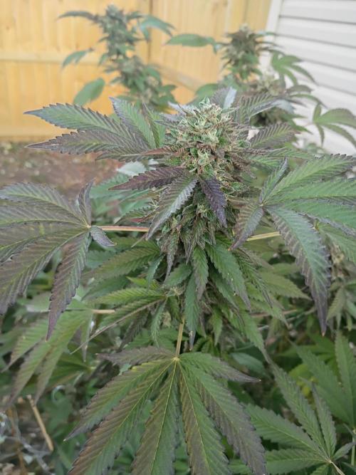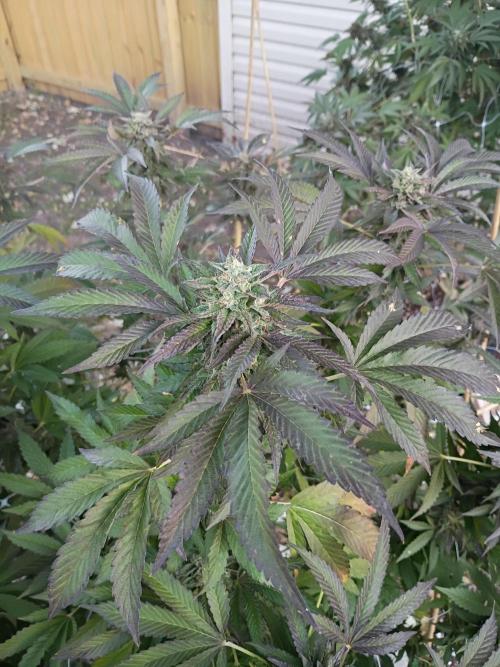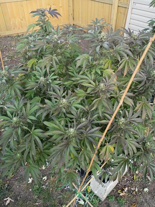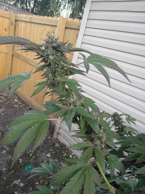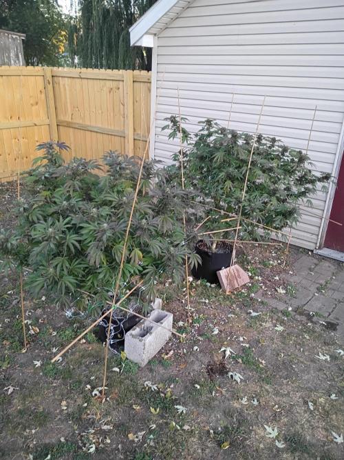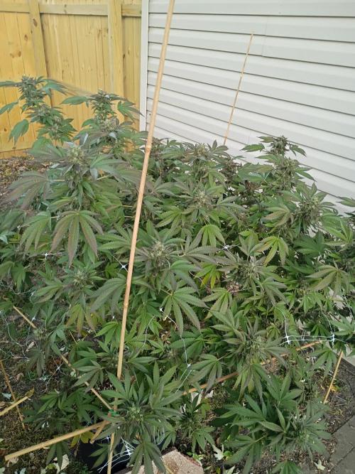 CWolcott1991 09/21 Got hit hard with a storm last night had em knocked over a couple times had to pen em against the garage to keep em up. They are definitely leaning and looking beat up one top branch broke off big pot. The smell is loud this morning though not both the small pot just smells green to me and not really terpy the big pot though at several feet away u can smell a sour milk kinda funk and as u get closer it gets sweeter and on a nug rub it's super sour and candy funk love it. I'm buying bamboo today to build support around em to finish the season strong hopefully went ahead and fed em both 1150ppm.