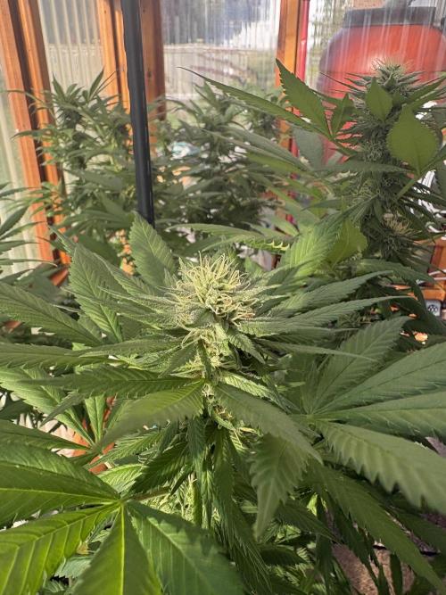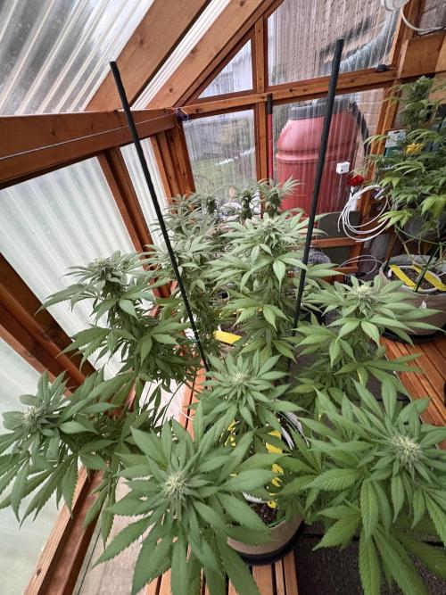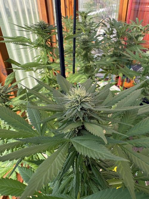 Purple Romulan is doing well and has what I would classify as medium sized flowers. Trichome production is not all that prolific, and I do not expect this plants flowers to exceed 20% THC. Plant and flower structure are quite nice, with the tightest internodal spacing of all specimens in the garden. The short, stout plant smells of pine, with a floral tone blended in.