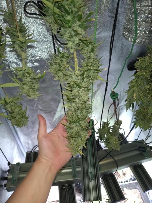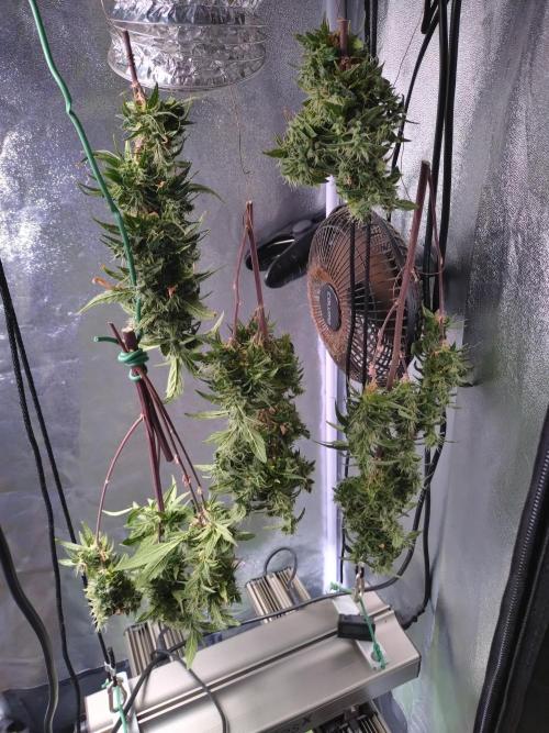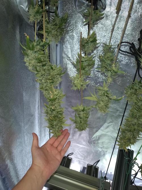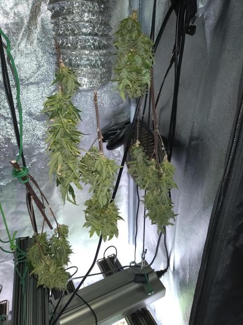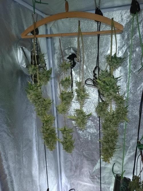 Nachdem ich die eine wegen Schimmel gestern schon platt machen musste, habe ich heute auch die andere platt gemacht. Jetzt hängt sie zum Trocknen. Der Grow hat wesentlich länger gedauert als gedacht und ich bin froh sie solange bei mir gehabt zu haben. Am Ende haben sich beide richtig schön entwickelt. Ich bin gespannt auf das Ergebnis