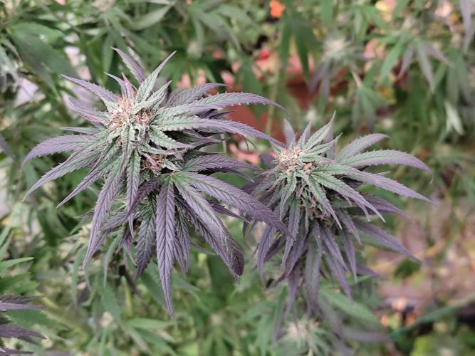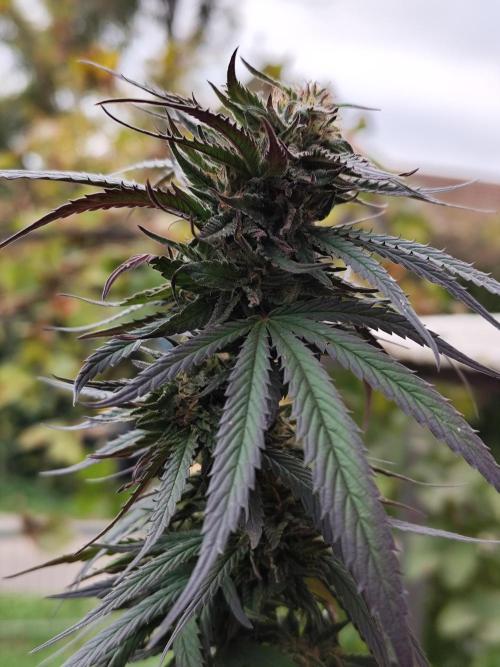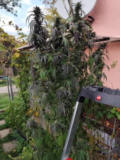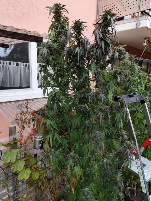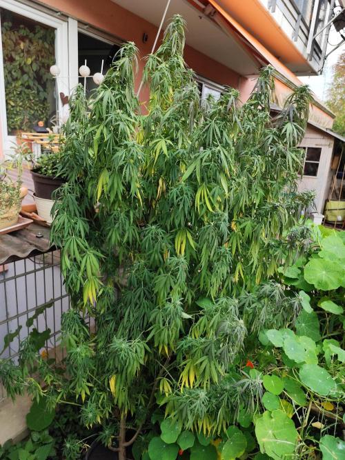 Tag 211: Für heute waren 20°C vorhergesagt, tatsächlich steckt die Sonne hinter dickem Hochnebel und es sind gerade mal 14°C. Heute Nacht geht's mit 2 °C Richtung Gefrierpunkt. Alle drei Ladies purpeln im Laub. Sie bekommen nur noch pures Brunnenwasser. Der abgebrochene Ast der Special Kush ist wieder komplett angewachsen.