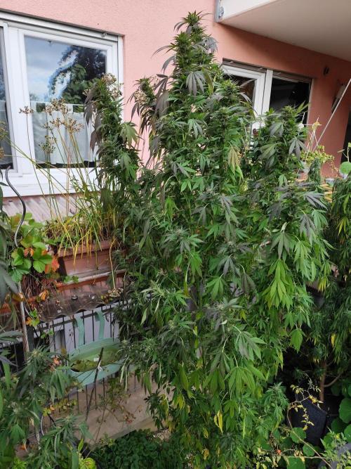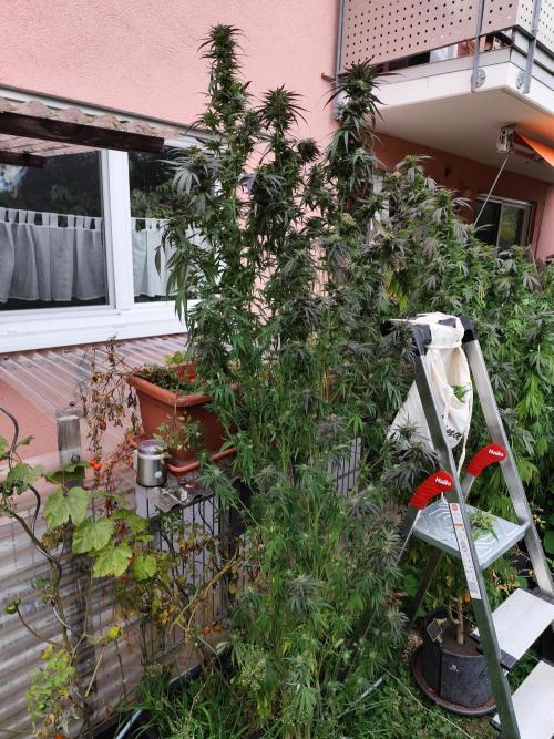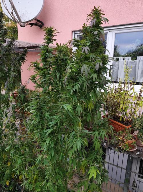 Tag 149: Wie man sieht klappt das mit dem Wegräumen wenn's regnet nicht immer. Wenigstens die ersten Sonnenstrahlen des Tages konnte ich einfangen. Mitte nächster Woche soll's besser werden. Obwohl das Trio den größten Teil der letzten Woche unterm Balkon zugebracht hatten, sind alle drei wieder gewachsen. Die Power Flower fem. misst jetzt 190 cm, die Special Kush #1 fem. 180 cm und die Royal Medic fem. 150 cm.