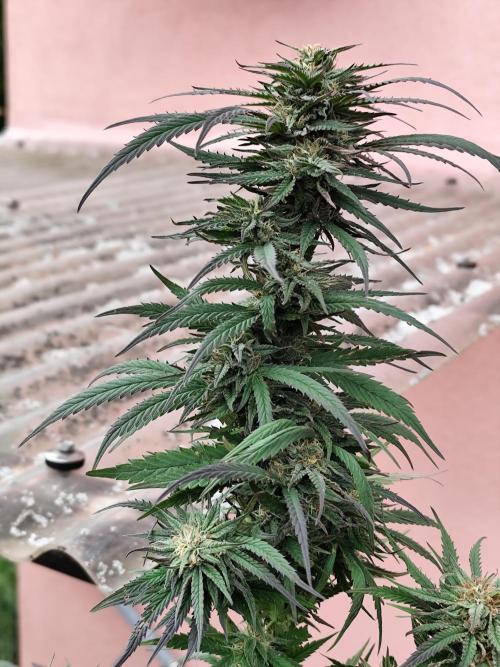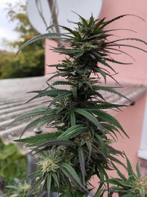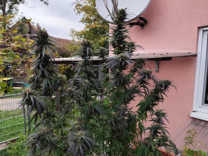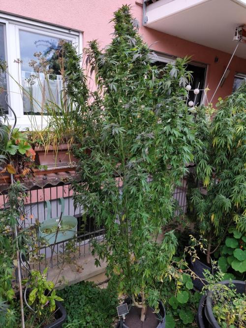 Tag 187: Die drei Ladies haben sich unter der Obhut meiner Nachbarin sehr schön entwickelt. Es hatte sehr viel geregnet, hinterm Rückhaltebecken war ein See und der Bach war voll bis zum Rand. Der Brunnen ist auch wieder offen. Die drei großen stehen jetzt wieder in der Sonne, heute hat's nur ein paar Wölkchen. Die Power Flower fem. ist jetzt 215 cm hoch, die Special Kush #1 fem. 205cm und die Royal Medic fem. 175 cm. Der Blütenzuwachs ist jetzt endlich deutlich zu erkennen.