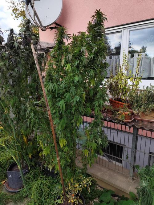 Tag 155: Endlich wieder 30°C und strahlender Sonnenschein bei leichtem Wind. Die drei Großen sind hinten am Zaun befestigt, so viel Coctailsauce kann ich gar nicht in die Töpfe füllen damit die bei stärkerem Wind stehen bleiben. Die Power Flower fem. ist jetzt 2 Meter hoch, die Special Kush #1 fem. misst 190cm und die Royal Medic fem. 155 cm. Alle haben mehrere Hauptstämme bekommen und sind sehr buschig.