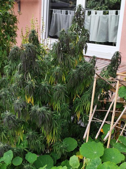 Tag 171: Die drei Großen in der Morgensonne. Vorgestern kam dann doch noch der ersehnte Regen, erst massiv, es hat geschüttet wie aus Eimern, dann über die Nacht schöner Landregen, kein Hagel. Der Bach hat wieder Wasser, der Brunnen bleibt zu. Die Power Flower fem. misst jetzt 205 cm, die Special Kush fem. 200 cm und die Royal Medic fem. 160 cm.