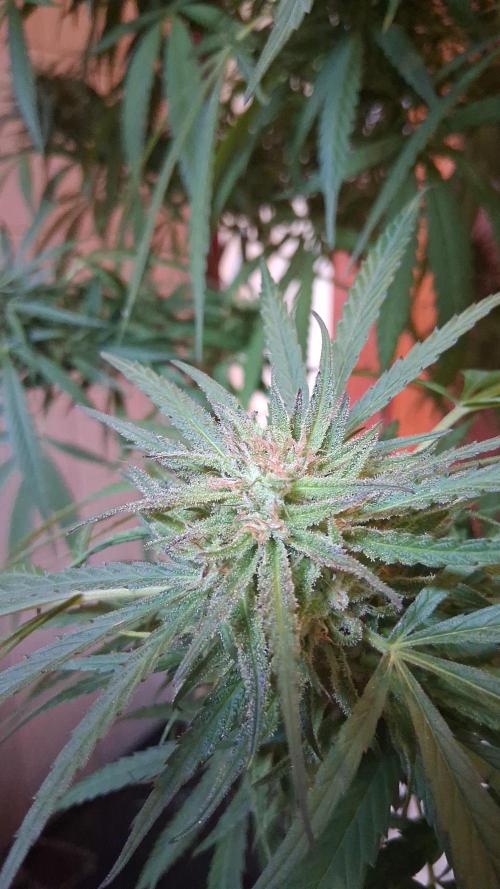 Trotz dem wenigen Sonnenschein beginnt sie mittlerweile Harz zu produzieren und Terpene zu produzieren was ein leckeres kush aroma schon zu riechen ist.