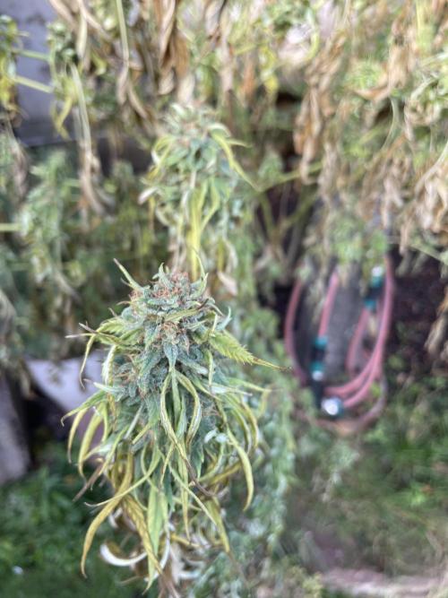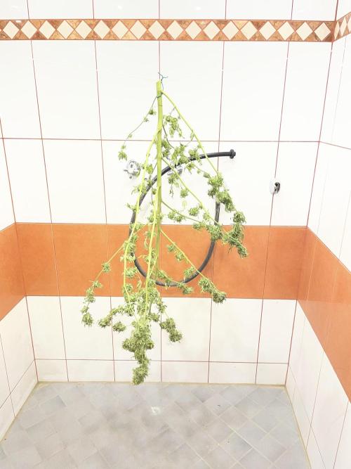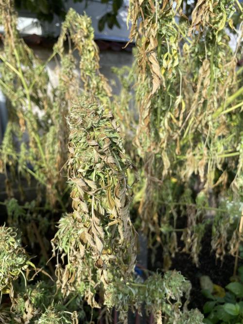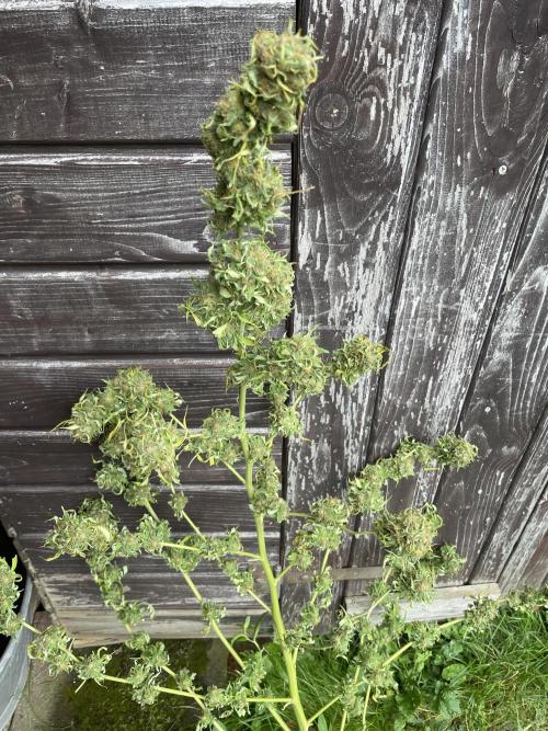 Sejanus21 In a matter of days the proud lady is in full autumn mode; leaves are yellow and hanging down. No mold yet. I started to harvest today after almost 200 days. The trichoms are mostly cloudy. It took me more than an hour to pre-trim one thick branch (and that is only a fraction of the tree ...). I might do another one on Tuesday. Let us see, whether I am lucky to hold off the end boss (mold) for another few days.
