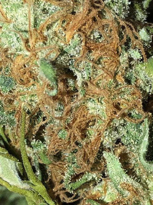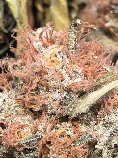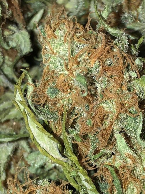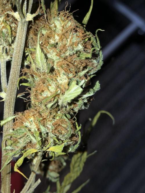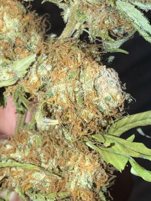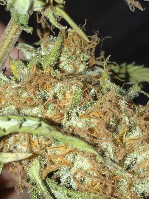 MindFlowers68 The buds are starting to flop over and starting to see the hair is transitioning in color more this week. Some have a really cool magenta color as a transition which is a first for me. I gave the plant a good shake from the bottom and that got rid of 80% of the old crispy stuff hanging on and I was good enough for me water twice this week. about 6 gallons each time the first one they drink a bunch quick. I have been getting more runoff with my recent waterings, so I think my heavy watering a few weeks ago it really helps get everything saturated and equalized in the pot. I am starting to see some of the upper leaves start to yellow and crisp up and I'm inclined to think it's more of a being hungry issue more than anything judging by the size of the buds. I would've like to see a Moyer even feed without crispiness, but I think she's using up all her nutrients just in time to finish up.