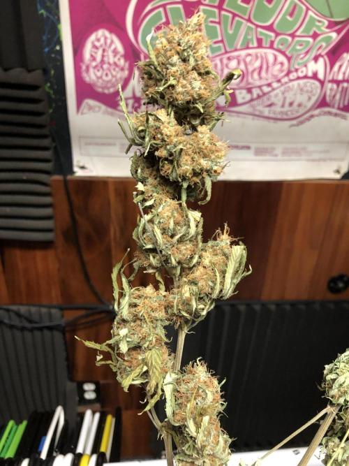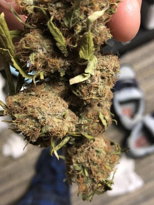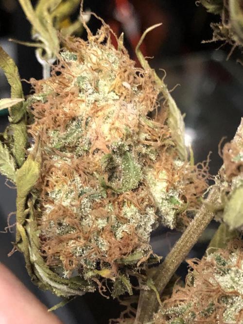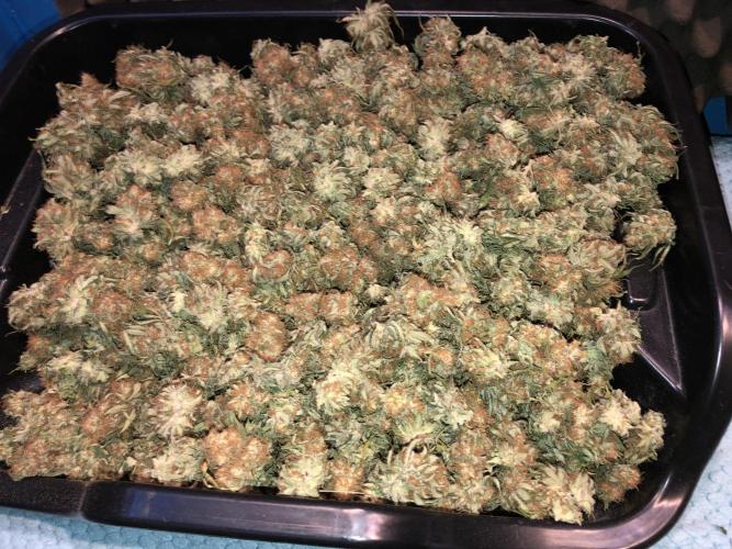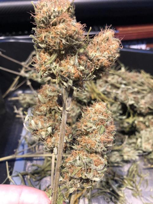 MindFlowers68 I chopped this beast down yesterday, and she didn't go down without a little bit of a fight. It actually wasn't really too bad at all. I was surprised I should've actually decreased the height the last two weeks to factor in for the flop, haha. A few of the colas were tangled, but for the most part I was able to just lift in pull then she popped right out. The were a few that were getting stuck and I was making some funny faces. I think these buds might be bigger than my Nevilles buds I'm not too sure, but they're pretty big if you ask me. There were even a few giant ones that were hiding. I started looking at the trichomes end of last week and they were already starting to look pretty mature. I could've harvested last week if I had really wanted to but by the end of this week, it seem like not too much of a ripeness, but a lot of amber around the sugar leaves and mostly milky. I didn't see any clears really. It took me an hour and a half or so to cut down and take pictures just the one plan. All of them total took like 5 1/2 hours or something. I had to get creative with the drying area because I have so much to dry at once. So I got the genius idea to take the top supports from my extra 3 x 3 tents and make a little drying cube. Miraculously, I had just enough space should take the stuff out better next time. They are sitting at 63°F and 60% humidity. I have fans pointing at the wall in the floor in my dehumidifier set to 60%. I'm definitely going to peek into these buds a few times a day to make sure nothing starts to mold they're definitely in that fatness level where they could mold just from being so freaking big. Got some cool fox tails and buds, growing on buds she didn't wanna give up.