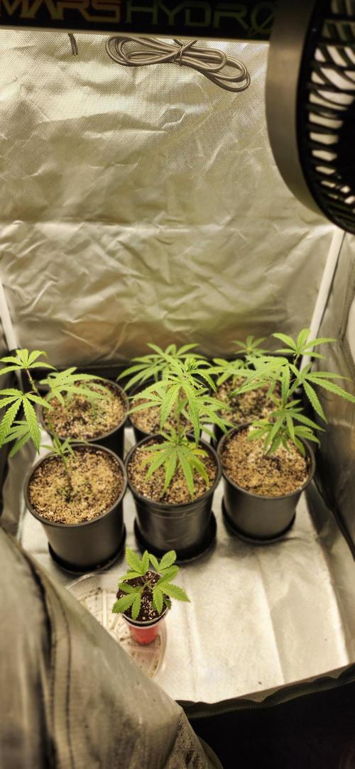 GREENPHOENIX6262 09/29 - Mother has been flipped into flower - first 11 clones transplanted into 1 gallon pots - baby set of 10 still in prop dome. I will be alternating between mother and clones for diary submission.