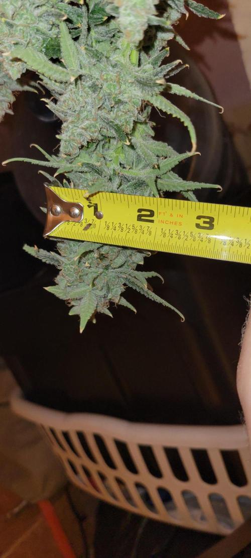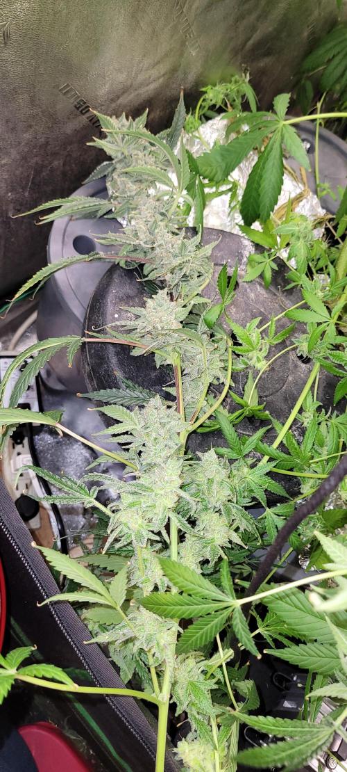 Stonerandgrower One left of three :)) the short one i got 7.3 ounces dry the one that looks weird was 5lbs wet and 17 dry and the one that's left has the biggest buds of them alll but I've got my neice staying and I can't harvest again for atleast another week
