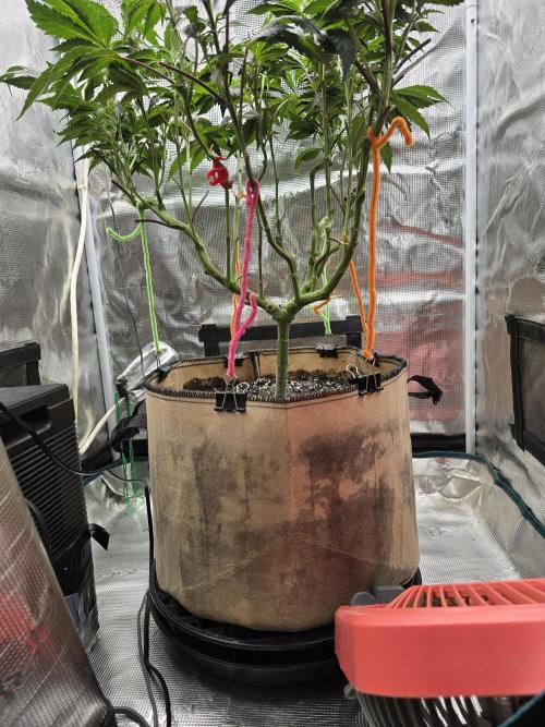 Hempface86 So as you can see, we have upgraded into a 5 gallon wide fabric pot and I'm going to give her another couple weeks to fill into her new home... i broke a couple of branches, definitely gave her silica to early on.. I'm not used to keeping plants in veg for this long... i do think when all said and done, she's gonna be a beast, so it'll be worth it... Thanks again @Grow4releaf!! Happy grown everybody God bless ✌️