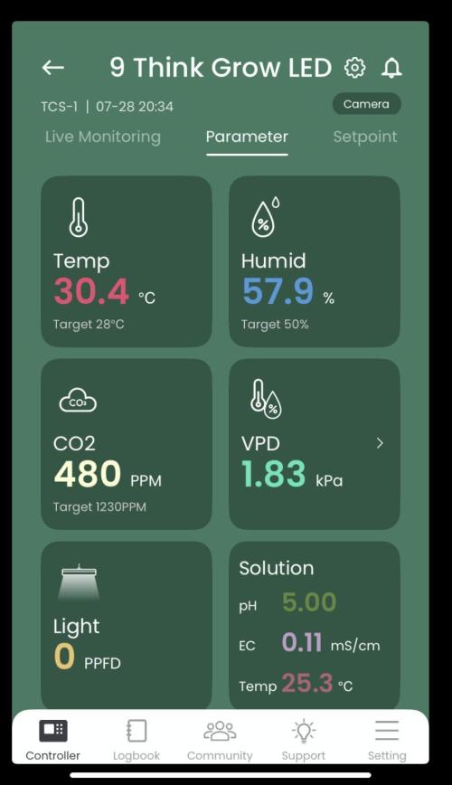 • Grow space: thanks to AC, canopy temps hold around 28°C with the lung room at ~21.8°C.