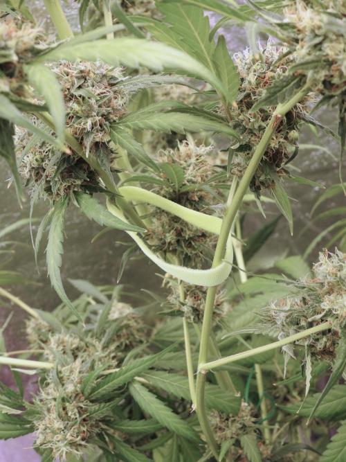 • Supercrop site: completely healed, producing solid flower along the bent top and nearby branches. A textbook example of how to redirect growth without losing yield.