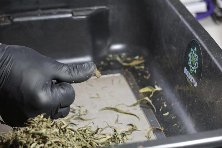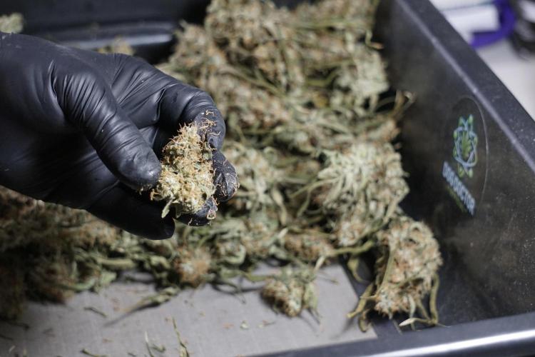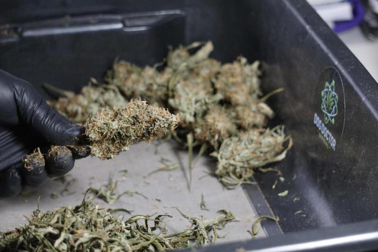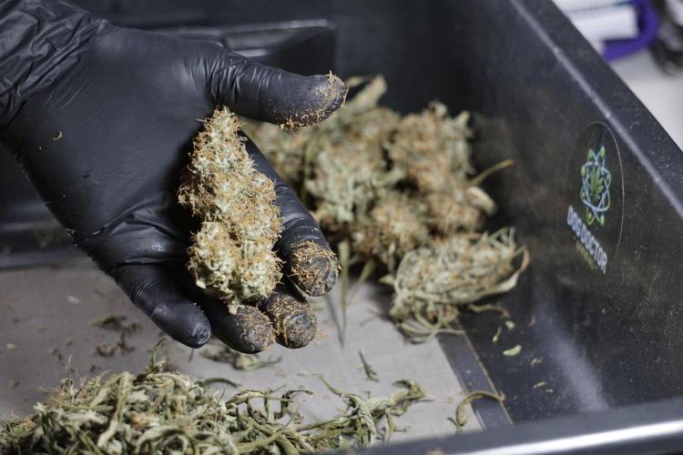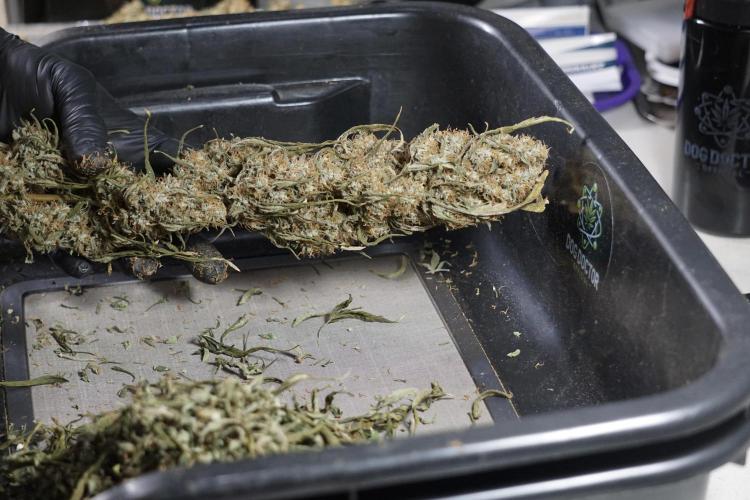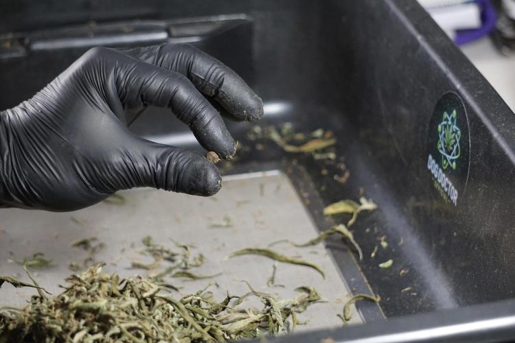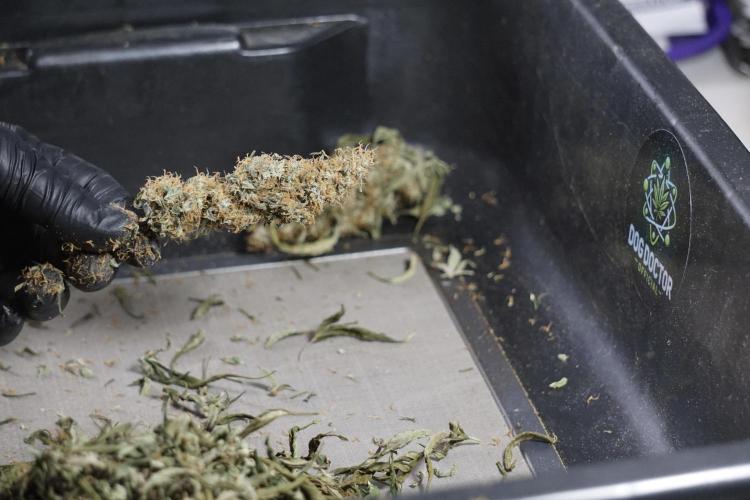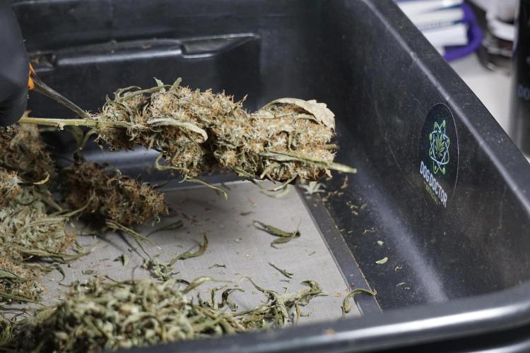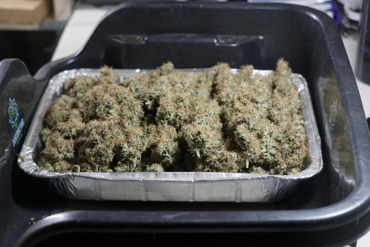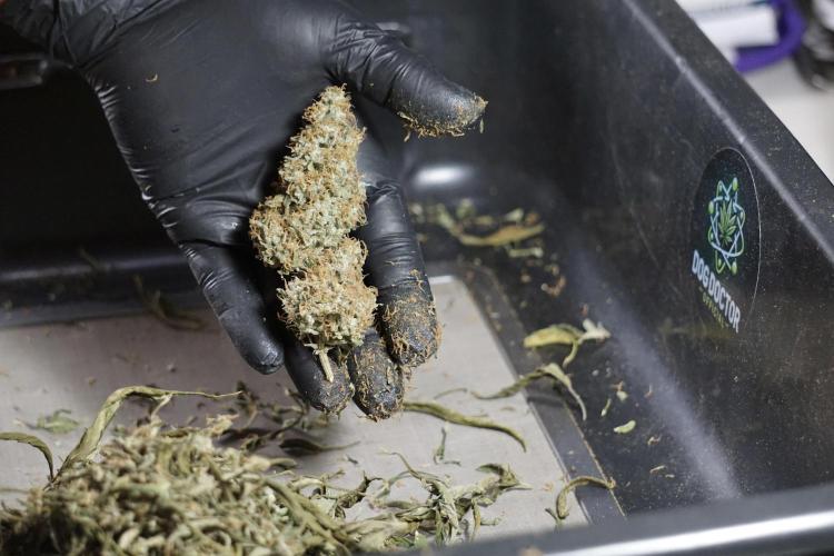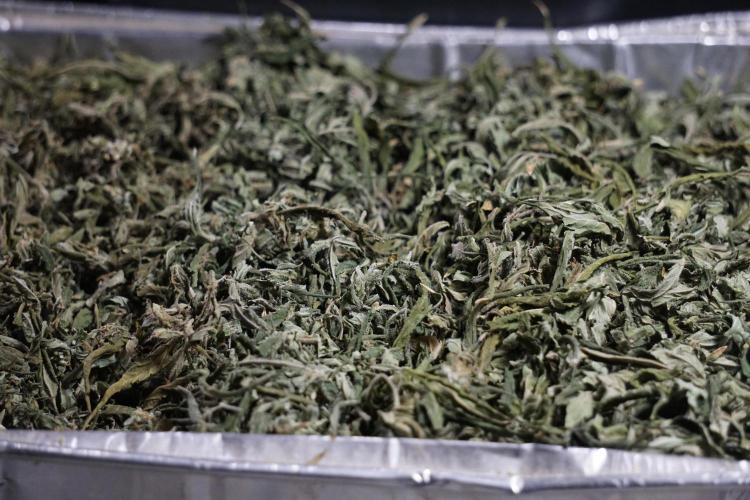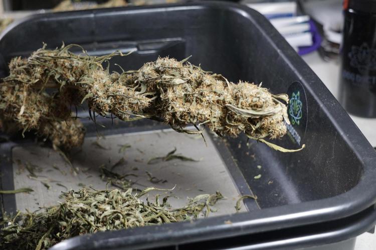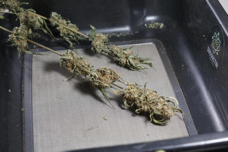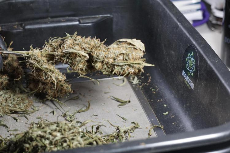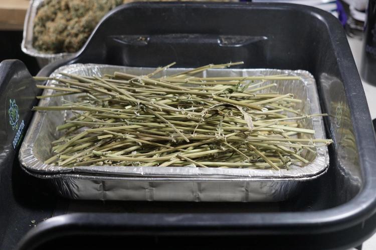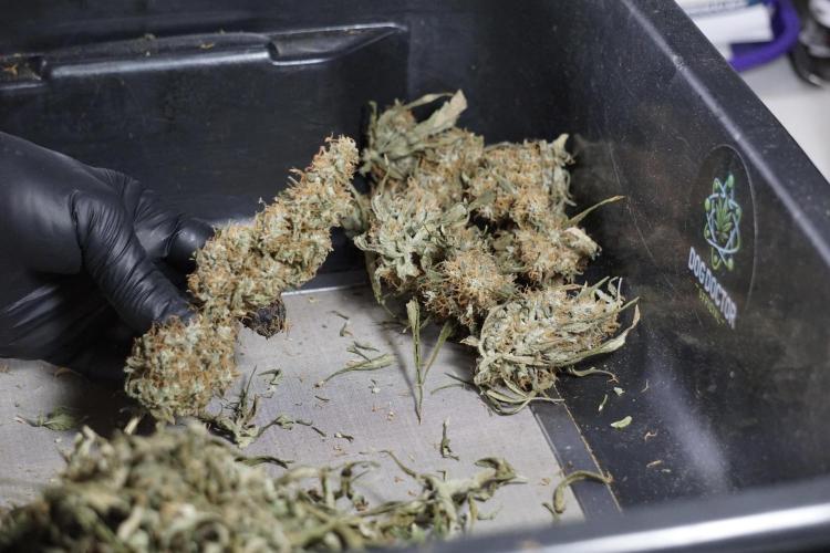 • After the two-week hang, the plants were moved to a dedicated trimming area and placed in the trim bin for processing.