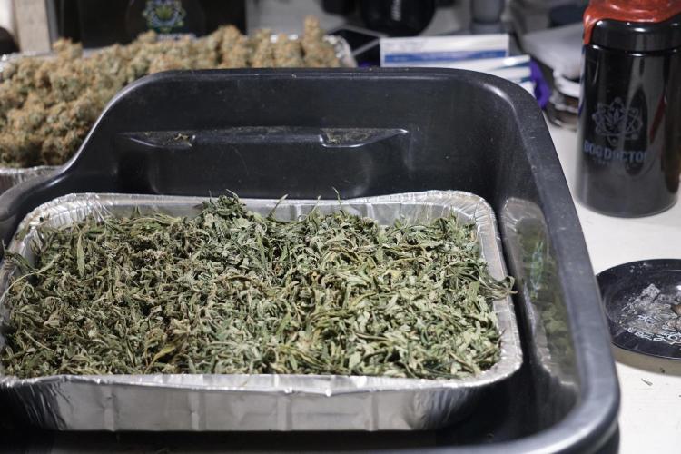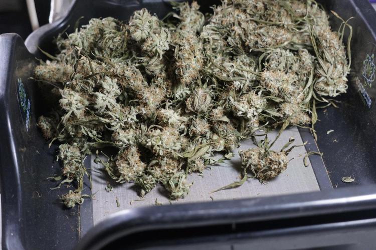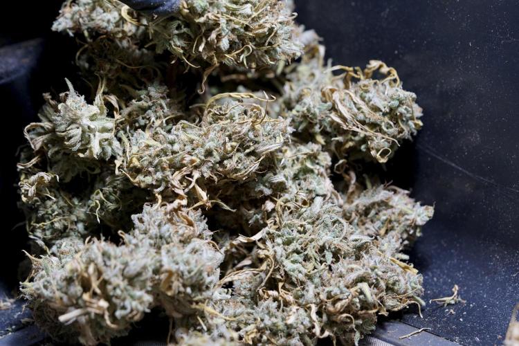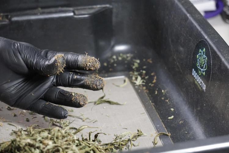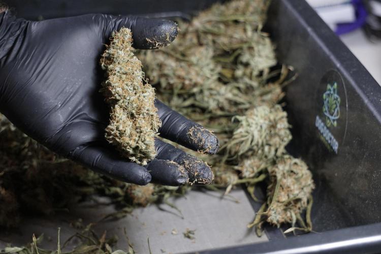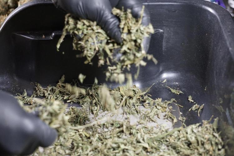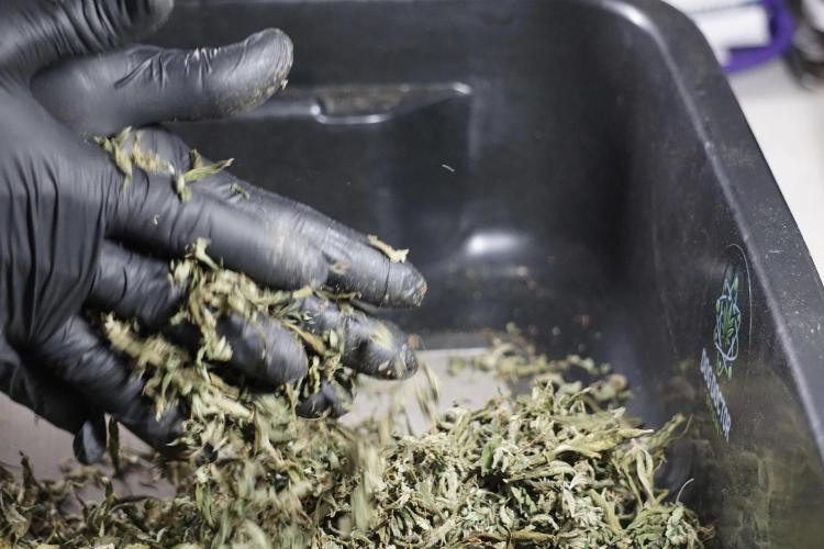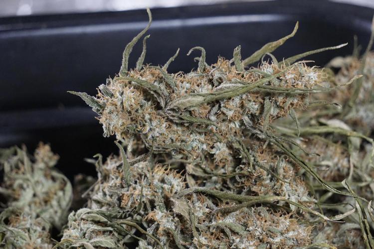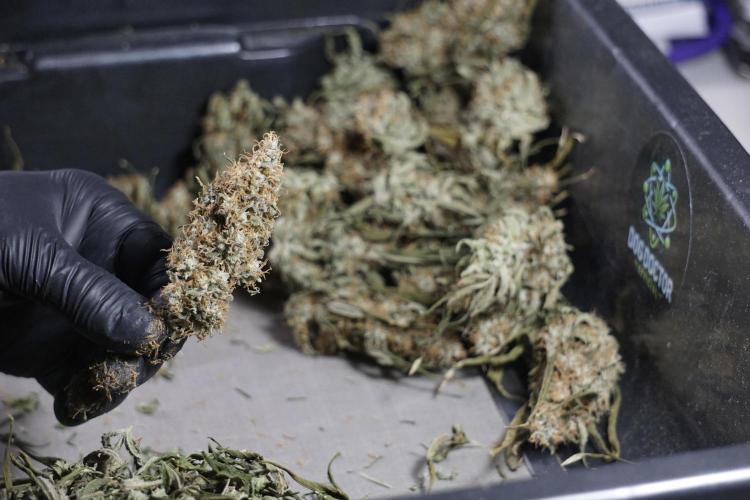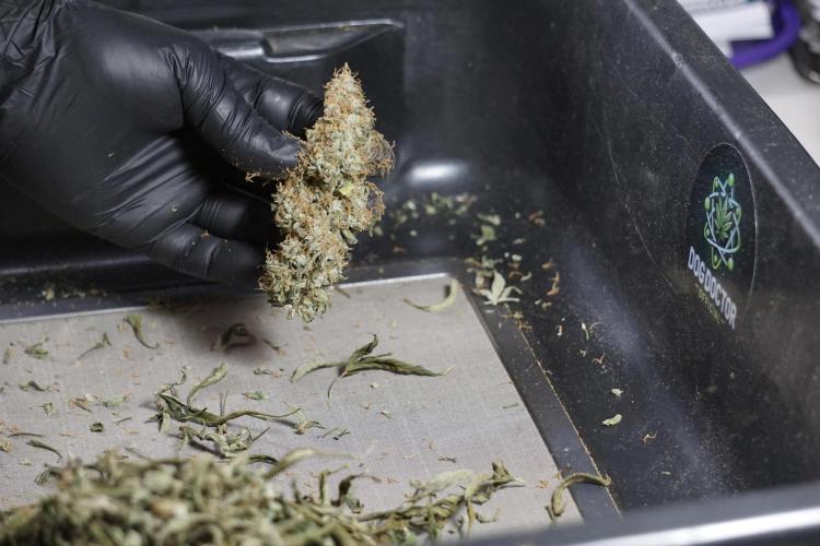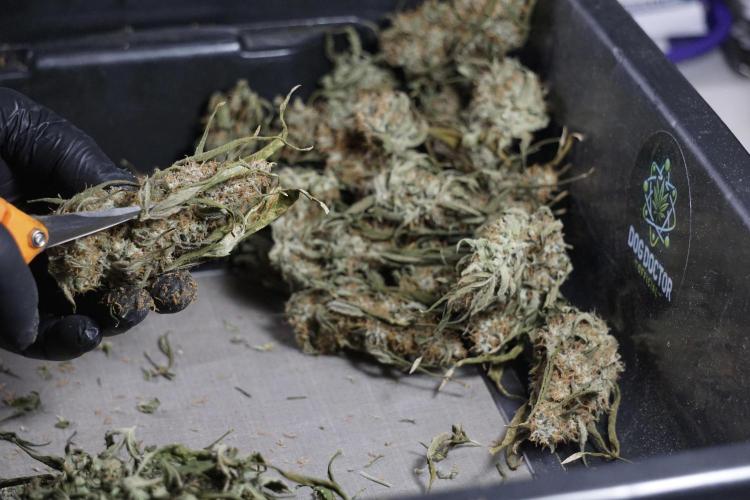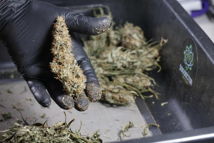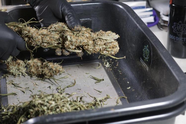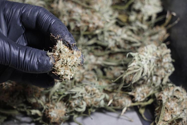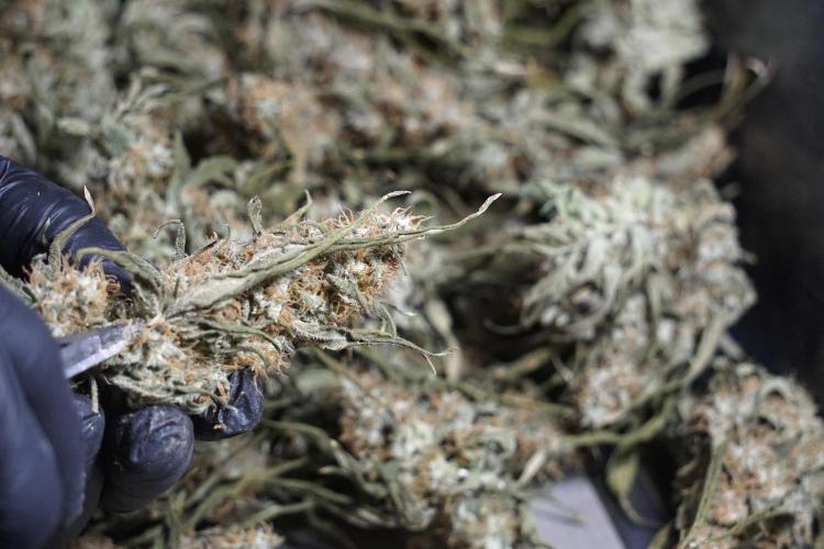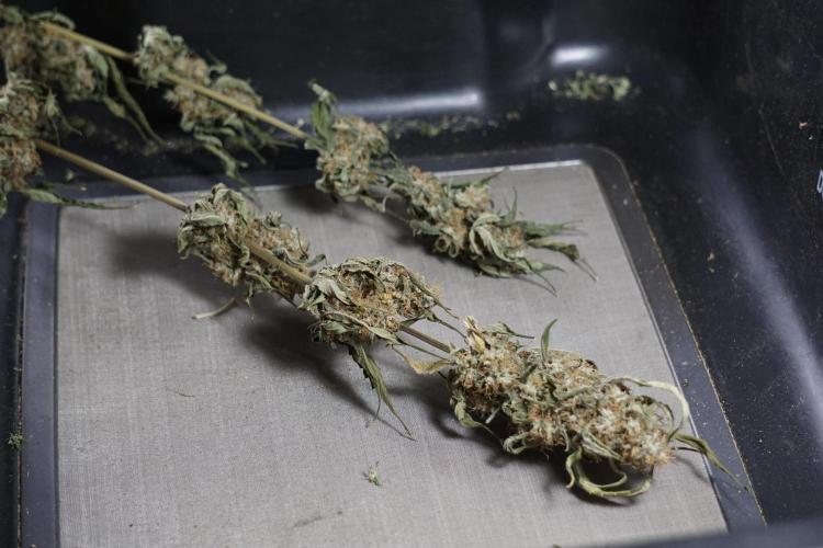• After the two-week hang, the plants were moved to a dedicated trimming area and placed in the trim bin for processing.