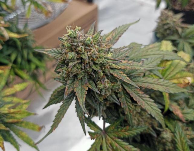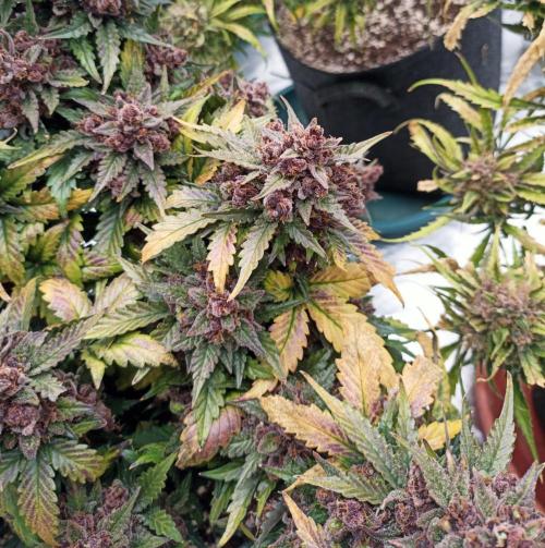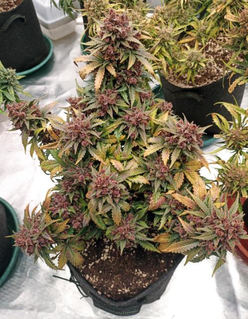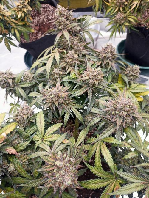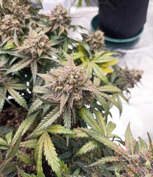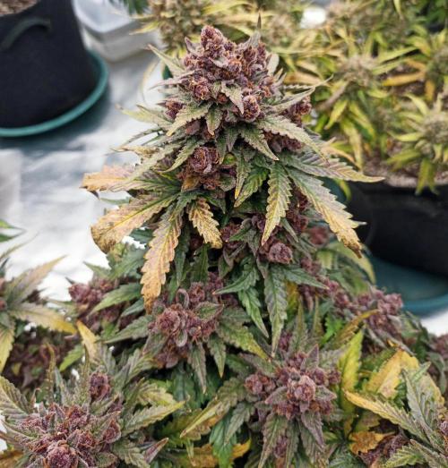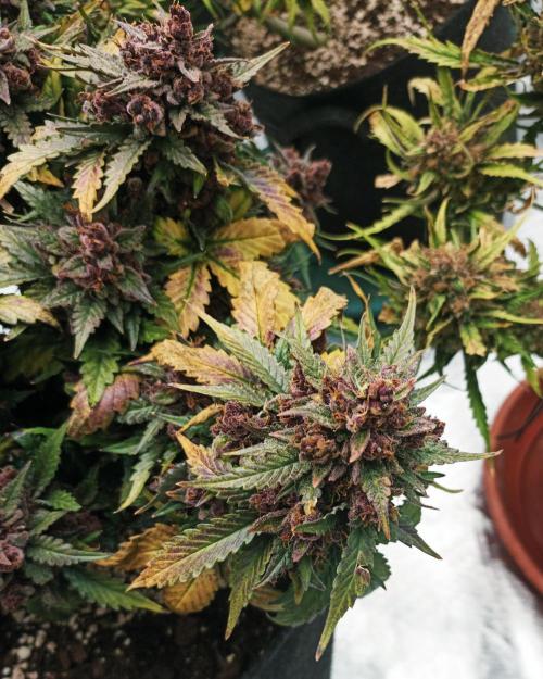 Sitting comfortably on the middle row, this strain is poppin.. the flowers are turning dark and getting cover with crystals. God damn it, looks almost poisonous 😅