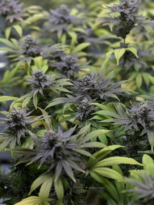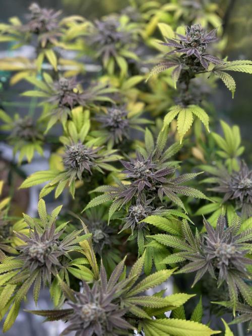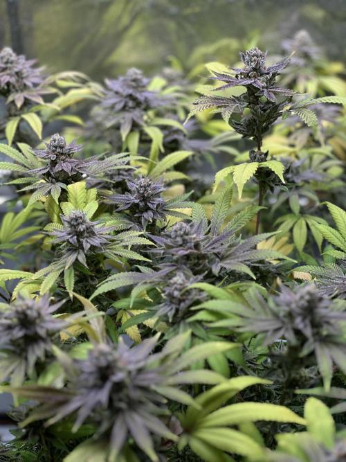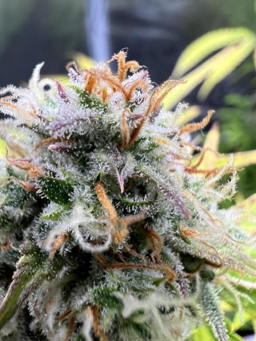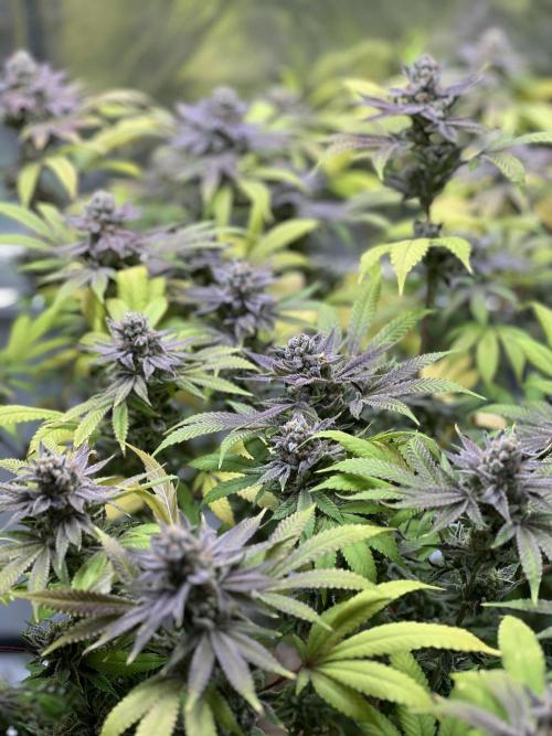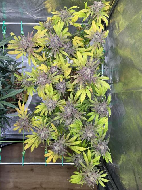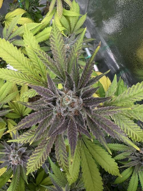 Blätter fangen an lila Ränder zu bekommen. Des Weiteren sind viele Trichome Milchig und die ersten Bernsteine entwickeln sich.