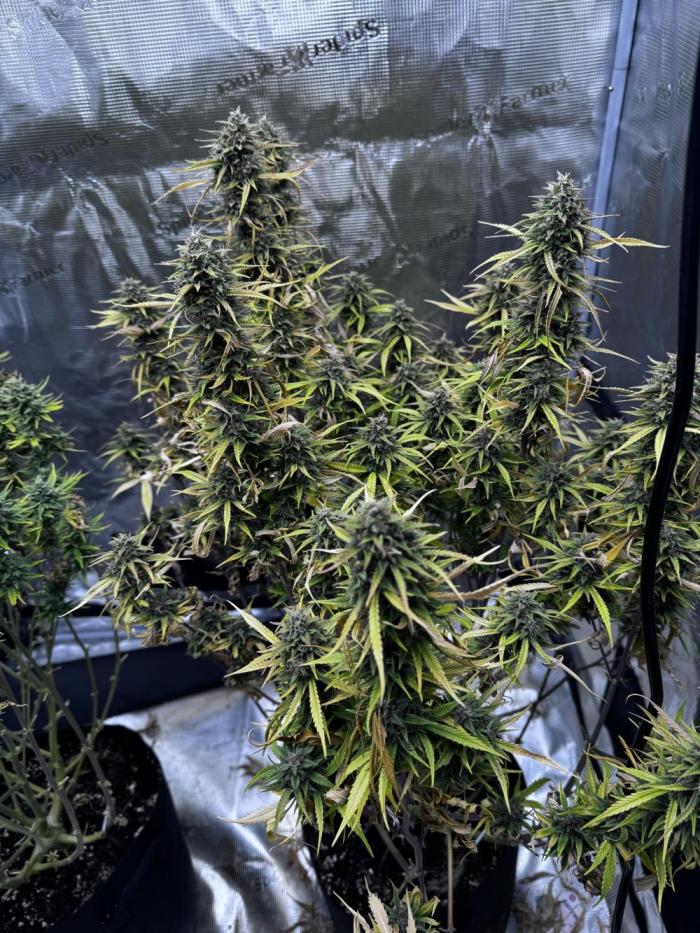 Die Buds entwickeln sich weiterhin gut, viele weiße Härchen stehen noch → sie legt noch an Volumen zu. Leichte Gelbfärbung der Blätter passt zur Blütephase. Keine Probleme sichtbar, alles stabil. In ca. 2–3 Wochen sollte sie erntereif sein.