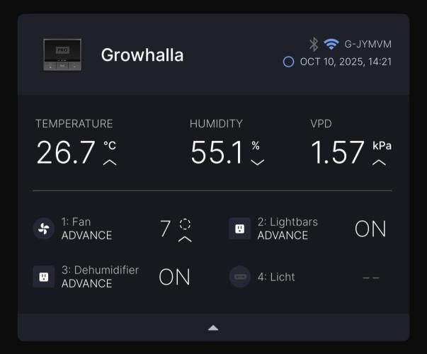 🔸The SANlight remains at 90% and ~30 cm distance (approx. 900 PPFD at the canopy). The leaves appear relaxed, without claws or lightening – so no indication of light stress. I keep the climate rather moderate, with good air circulation through the foliage so that the fresh resin heads remain dry. It's a bit cold at the moment, so I can't quite reach the VPD, but I'm not going to put a heater in, hehe.