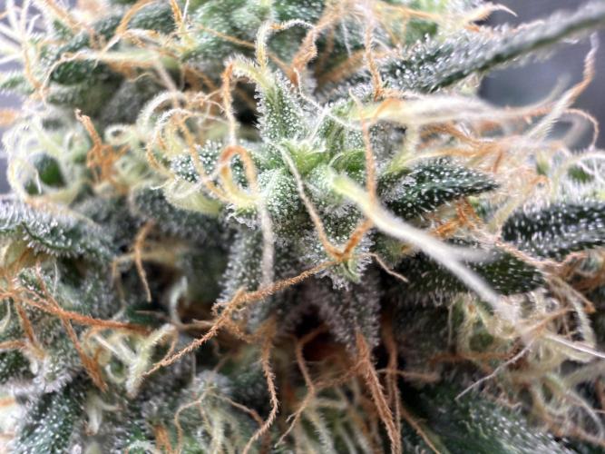 The trichomes of the entire top cola are milky. There is an occasional brown one and an occasional clear one, but the top is done.