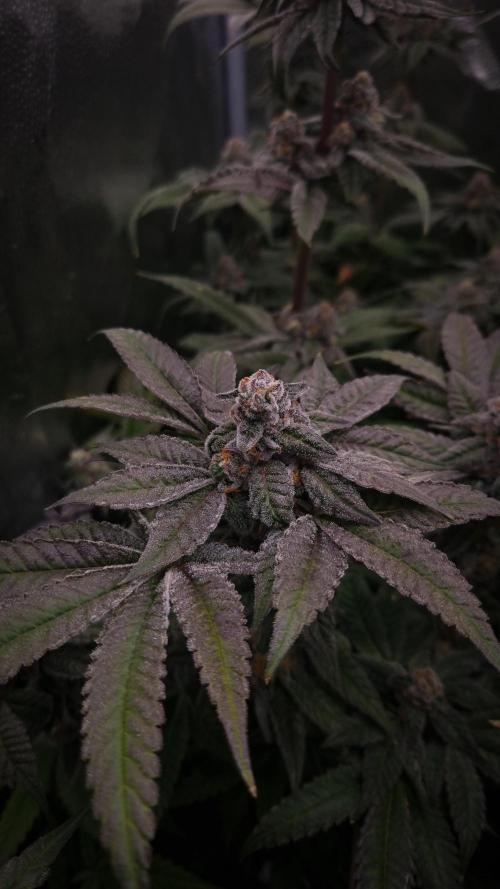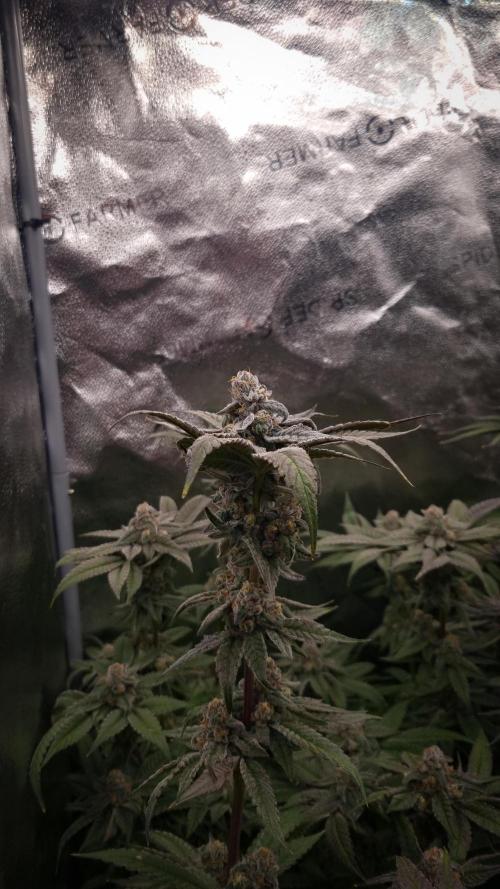HippyHemulen She starting getting nice frosty and never seen so much thrichomes spreading to fan leafs, they are almost about 2/4 - 3/4 covered too. Smell is forming stronger.