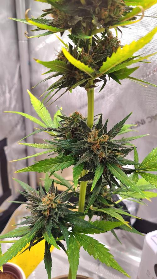 Shes gained height slighty and is quite tall, the light is only 6 inches away in my little tent! Ive stripped away the bottom two tiers as theres little light near the bottom and ppfd at the top of the plant is 500.
