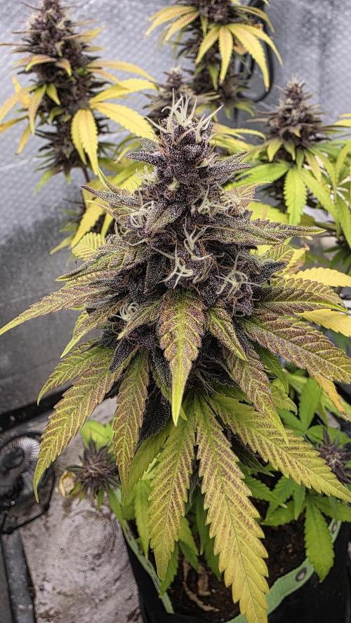 IndicaA-A Its been a while since I updated, sorry about that. I topped her at the third node around week 3. She is now in week 6 and flowering. Her buds are a gorgeous purple! She's been at half feed of nutrients that I would consider a full feed. I will steadily increase nutrients over the next few feedings. She's been a breeze to grow, no problems what so ever. Other than topping I've done almost no maintenance, not even clearing lower leaves. I am exited to see her grow big and fat!