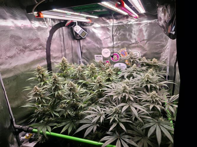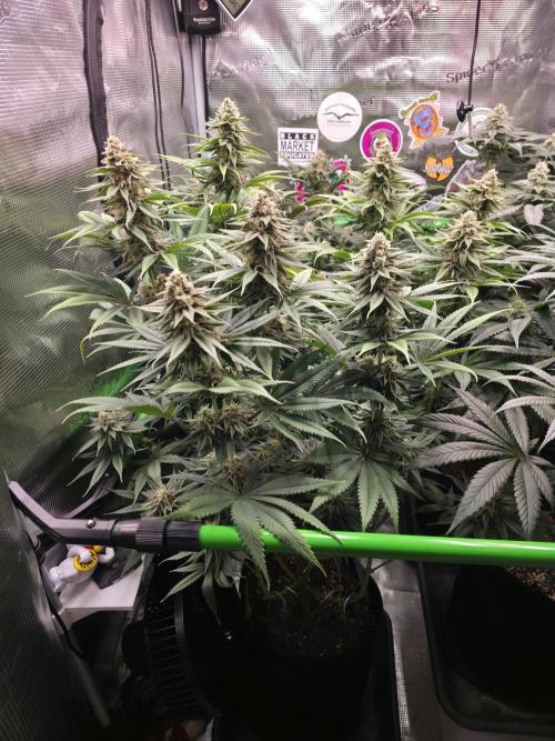 McBubatz 10. Woche, Mimi gehts gut, etwas verbrannte Blattspitzen aber nur gaaanz wenig. Die Pflanzen bekommen jetz alle weniger N, da doch alle recht dunkle Blätter haben. Hab mal ein kleinen Geruchscheck gemacht, die Mimi und die Meth sind beide extrem Zitrus lastig im Geruch, die Mimi eher so Orange/Cream in Richtung Multivitamin Saft richtig lecker.