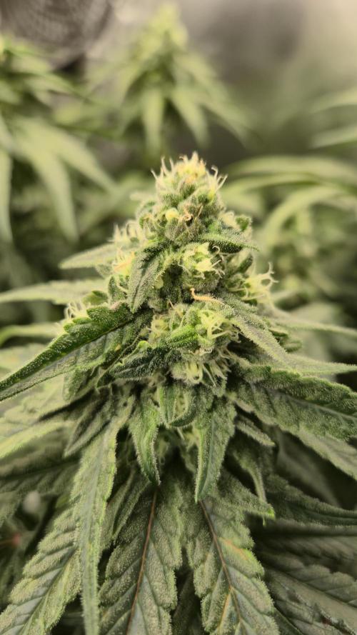 Schöne stinkige Blüten am Blümchen welche so langsam immer dicker werden. Trichome sind, wie zu dieser Zeit bei 56 bis 63 Tagen agegebener Blüte zu erwarten, noch Glasklar. Da das Blümchen zwischenzeitlich Adlerklauen bekam, wurde die Wassermenge, sowie Düngerkonzentration reduziert.