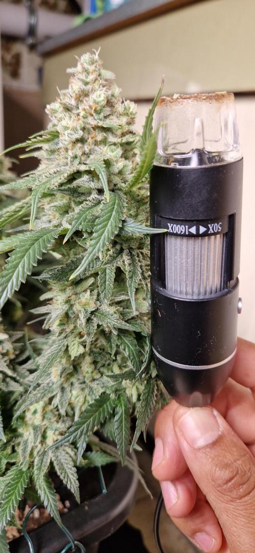 Hollywood Diese Woche wurde nicht viel verändert, gleiche Düngemenge wie die Woche zuvor. Die Trichome sind überwiegend milchig, noch paar glasig und minimale Bernstein. Werde die nächste Woche dann nur mit Wasser gießen und einen Spülgang durchgehen.
