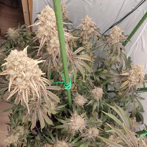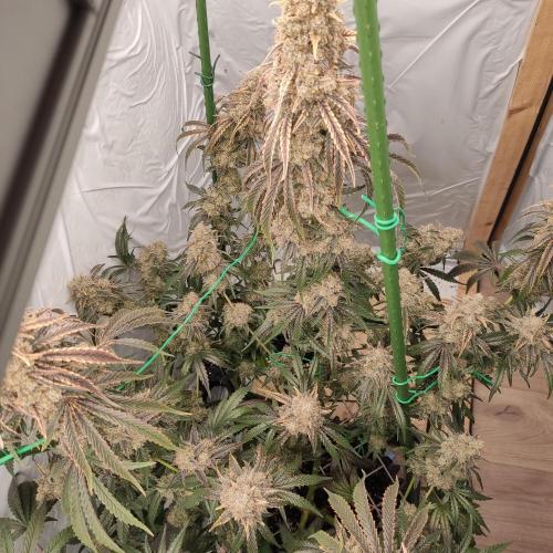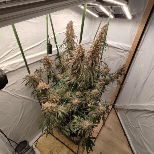 23_GG_GROW Sie hat endlich aufgehört sich zu strecken. Warum die soooo in die Colas noch gepumpt hat? Hatte die soooo schön auf zwei kurzen Ebenen. Naja erstmal Rainbow Sherbet in der Box und eigentlich mit gerechnet das die kleiner Indica Lasstiger wächst,weil 70% Indica aber ist ja mit 150cm angegeben. Ist ne ganz tolle Pflanze ,hat sich auch jeden cm genommen den sie bekommen konnte. Nun mit den 3x Evos bekommt auch jede Ecke Licht. Läuft eigentlich super.