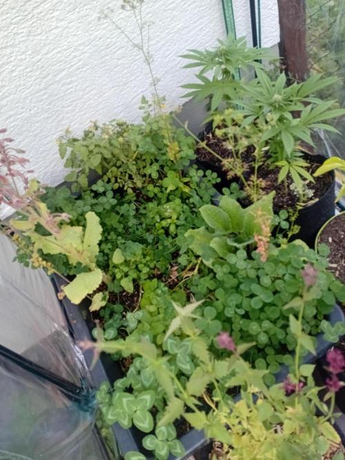 I cut some lemon balm, lavender, curry plant, and various other herbs, dried them, and placed them on the soil to repel pests, etc.