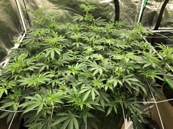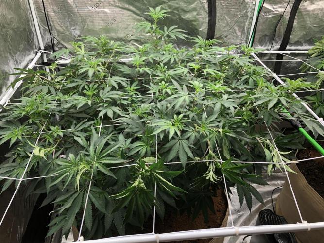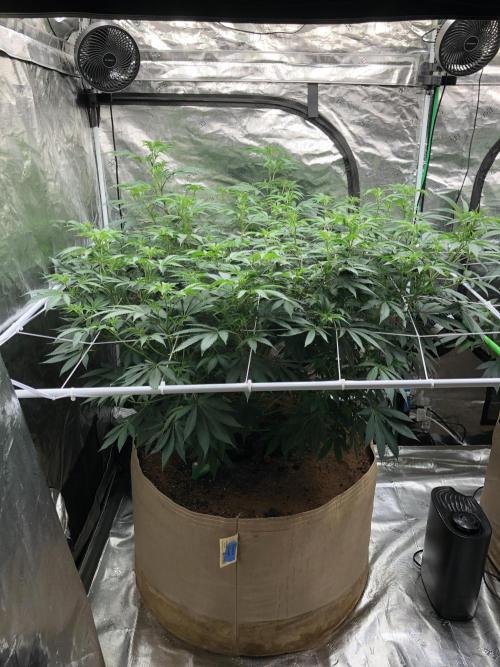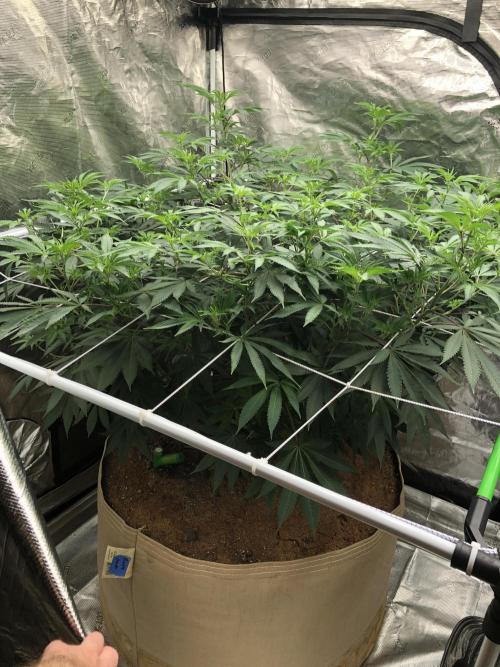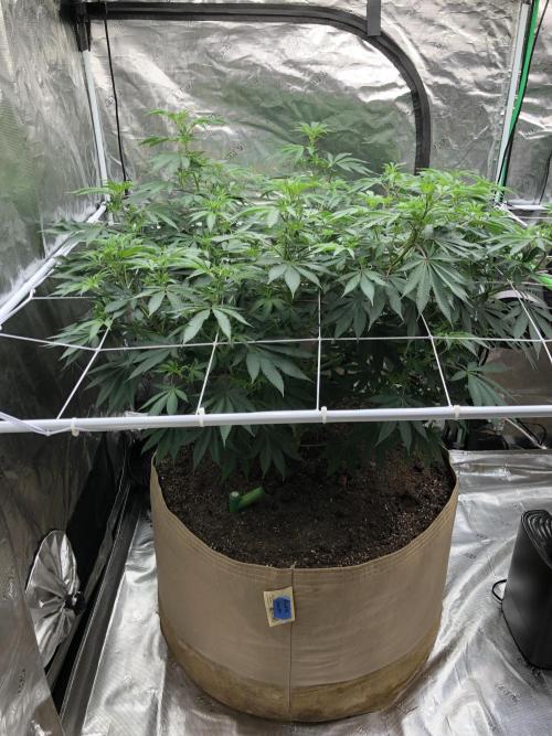 MindFlowers68 There is not much to report this week as things are on autopilot and going smoothly. The foliage shows the plant is thriving, and little to to no signs of stress. I only had to water once this week. The only other thing that was need was training some of the branches down and to the edges of the tent. She's pretty much got a perfect canopy going, and was able to control some of the stretch by scroging. After training I think i may have nearly doubled the amount of tops on the plant from the new nodes growing in strong and starting to stretch. I dialed back the humidity down to 58 percent and going to try and lower it gradually to 45 by harvest time.