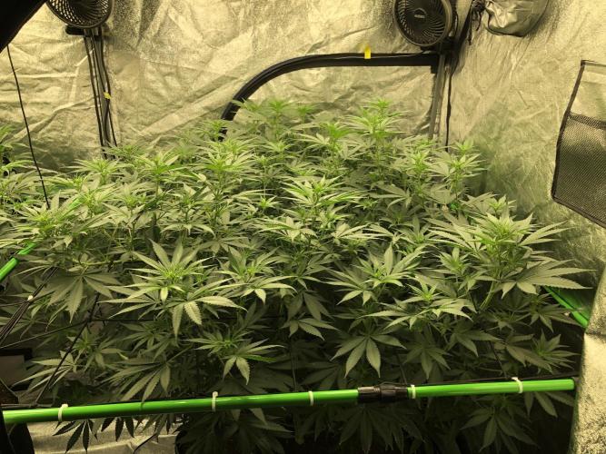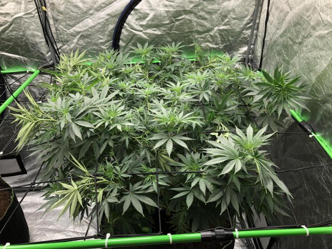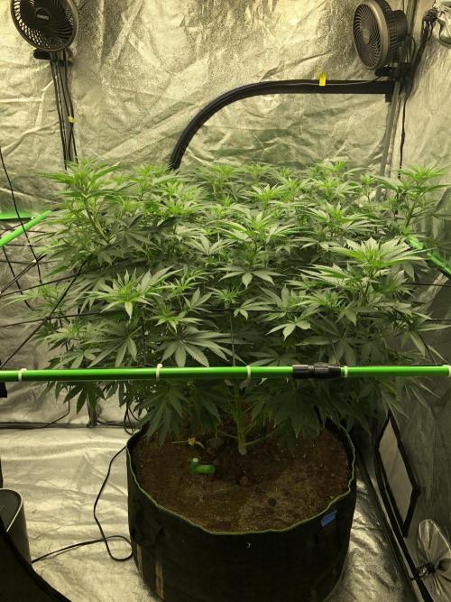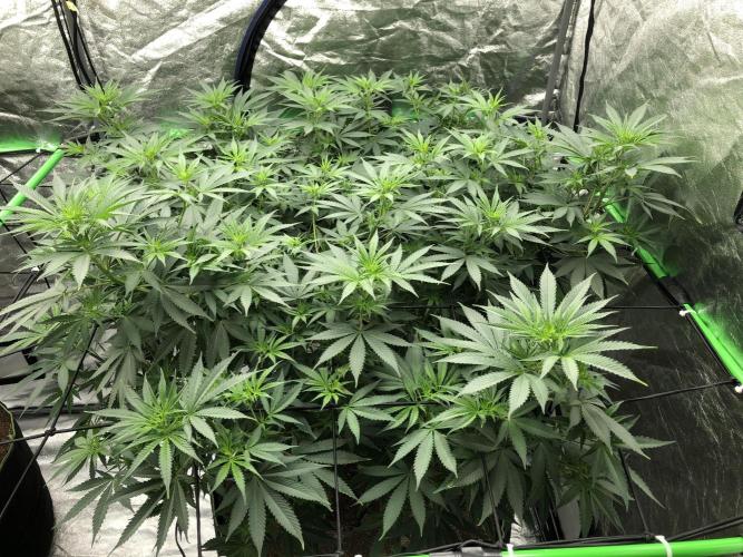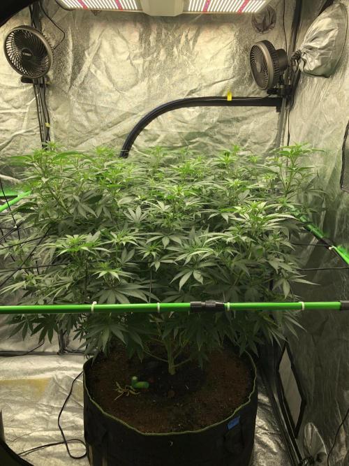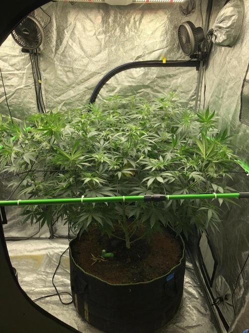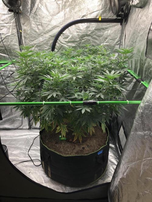 MindFlowers68 There is not much to report this week as things are on autopilot and going smoothly. The foliage shows the plant is thriving, and little to to no signs of stress. I only had to water once this week. The only other thing that was need was training some of the branches down and to the edges of the tent. She's pretty much got a perfect canopy going, and was able to control some of the stretch by scroging. After training I think i may have nearly doubled the amount of tops on the plant from the new nodes growing in strong and starting to stretch. I dialed back the humidity down to 58 percent and going to try and lower it gradually to 45 by harvest time.