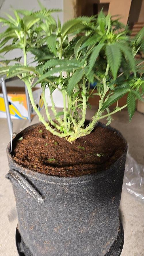 This plant has been topped many times (around 8–12), creating a very wide structure with lots of potential bud sites. However, it is currently in poor condition due to stress from overwatering.