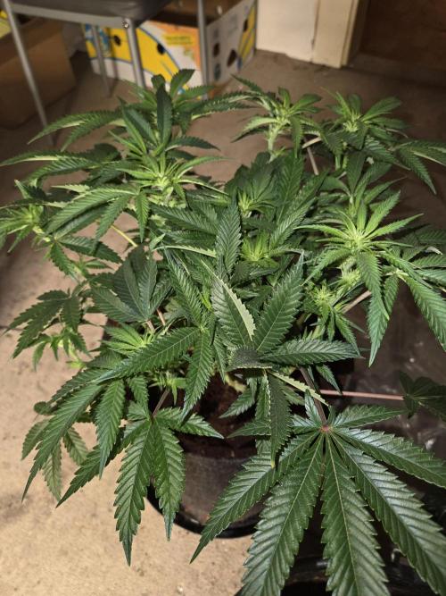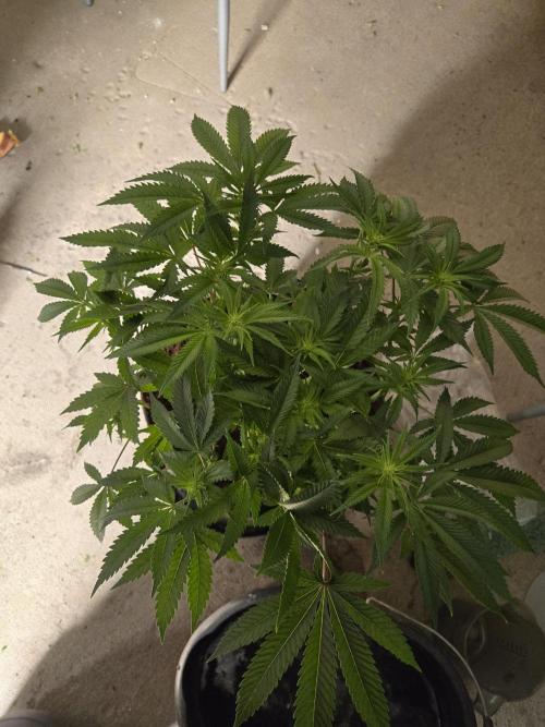 This plant looks fairly healthy overall, with a dense and compact structure. The canopy has filled out well, showing tight node spacing and several potential tops developing. Leaves are mostly a solid green, though some lower foliage is beginning to fade and yellow slightly, which may point to early nutrient demand or reduced light penetration.
