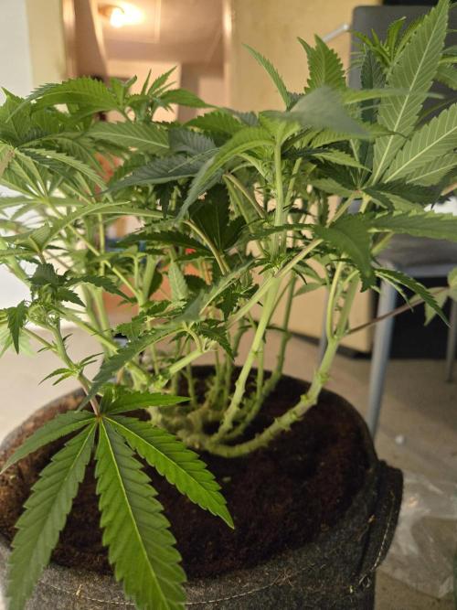 She’s looking sturdy for two weeks in. Cotyledons are still hanging on, and the first 5-finger fans are opening up nicely. Color is a healthy deep green, and stems are already thickening up with a slight purple hue on the nodes — likely just her genetics. Growth is even, no signs of stress, and she’s handling the 18/6 light cycle well. Light’s at 40 cm now to keep her from stretching too much. Thinking about moving her into a bigger pot in a few days to let the roots run free.