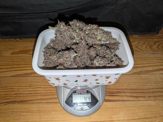 As with my first Banana Purple Punch grow, the buds are relatively fluffy, except for the main bud. But I'm happy to have a purple phenotype this time. The smell is a bit soapy, but it will definitely intensify with drying. I'm curious to see how much the yield will be after drying.