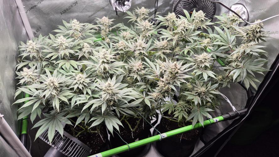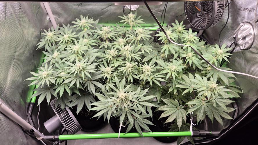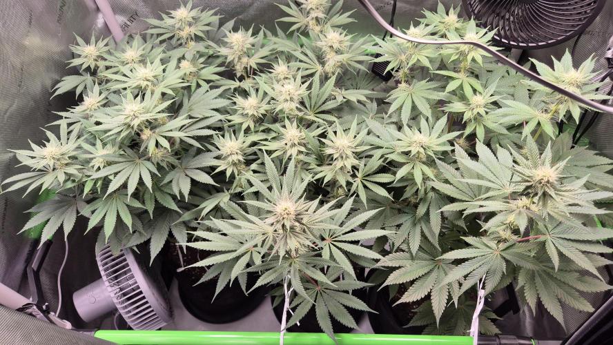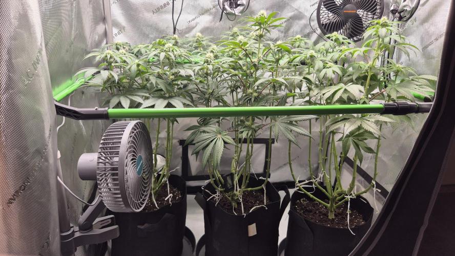 Leaf tucking and defoliation continues to keep the canopy even and allow light to reach the lower branches. The structures feel strong, and I improved airflow (hopefully) with a clip fan positioned at stem height to move air just below the canopy.