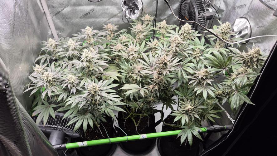 HillNSage This week I did the last major defoliation round. I also tied down the tallest tops of plants B and C to the green support stakes around the tent, mainly to improve airflow through the canopy, but also to ballance the height of the canopy. The runoff EC, especially from plant B, came out a bit high, so next time I’ll give her a lighter feeding and flush a bit more to balance things out.