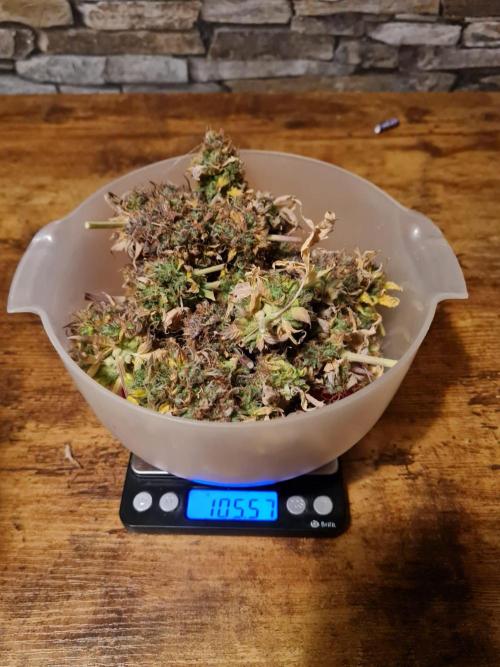 CeeJayy420 She’s been chopped and trimmed—final weight came in at 105g. The buds are dense, pleasantly heavy, and absolutely beautiful. They shimmer like green velvet under the light, a texture and glow that feels almost surreal after weeks of care and anticipation. It’s a satisfying end to the cycle, and seeing the results laid out makes all the effort worthwhile. Now onto drying and curing, with hopes of preserving every bit of that richness.