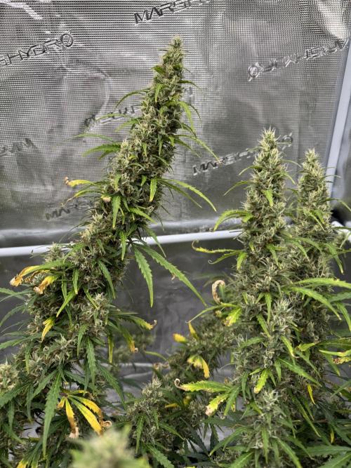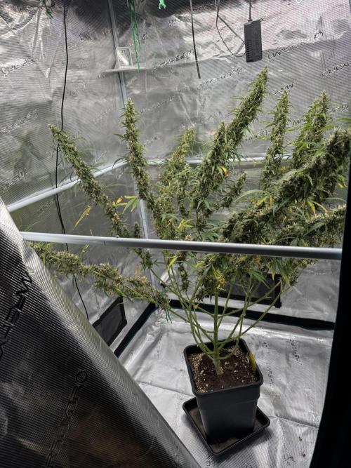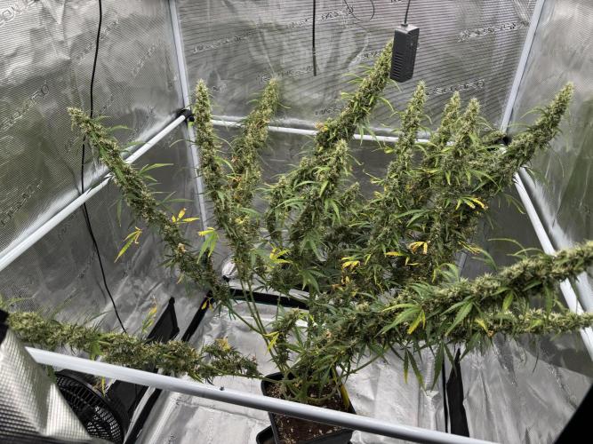 Splashy Sie ist noch ein richtiges Monster geworden. Dadurch das ich 4 Pflanzen in einem 1m x 1m Zelt hatte, haben die sich gegenseitig die Triebe gestützt und die sind nicht wirklich kräftig genug geworden um sich selber zu halten. Deswegen hängen die jetzt so durch und easyrolls wollte ich jetzt nicht extra wegen einer Pflanze holen. So hat sie halt die ganze Fläche im Zelt ausgefüllt und nochmal alles gegeben. Morgen ist es soweit und ich ernte sie, diesmal hänge ich sie nicht ins Zelt sondern werde sie in einem Hängenetz mit dryfermbags trocknen. Wird mein erster trocknungsversuch mit den Tüten und ich bin gespannt was sie so können.