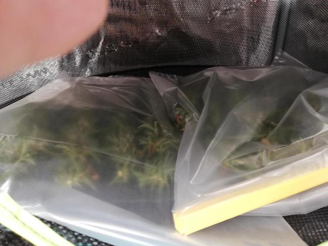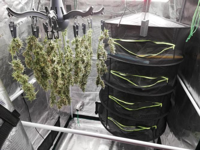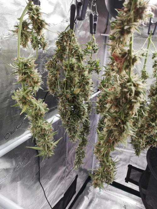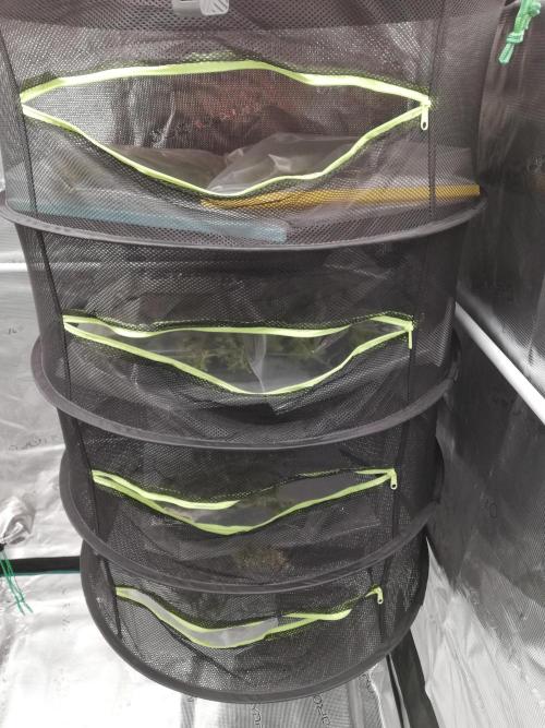 Splashy Bei der letzten Pflanze, welche das Problemkind war, habe ich mich dazu entschieden sie 2-3 Wochen länger stehen zu lassen. Jetzt waren die Trichome teils Bernstein und für mich damit erntereif. Ich habe jetzt zum ersten mal das Hängenetz ,welches bei dem Abluftset dabei war, genommen und die Buds so gut es ging in die DryFermBags gemacht und dort rein gelegt. Unten habe ich einen statischen Lüfter an und die Abluft auf 25% stehen. Ich werde die Feuchtigkeit im Zelt die nächsten Stunden und tage im Auge behalten und gegebenenfalls die Abluft höher stellen. Der nächste Run wird mit den Lemon Cherry Cookies Auto sein, freue mich schon sehr auf den Strain