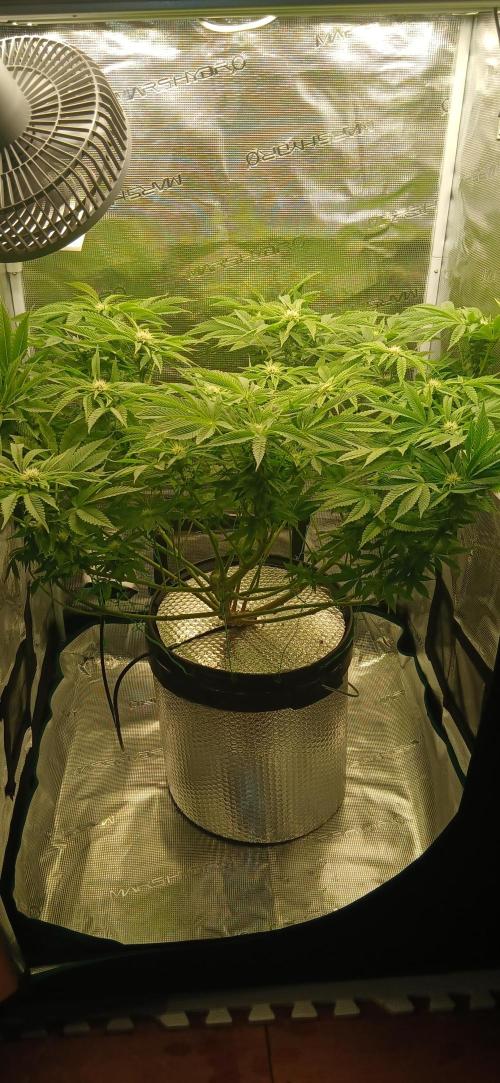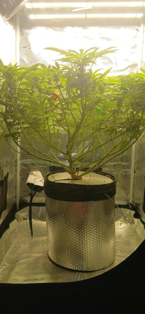 Two days ago I added water to reservoirs as she needed topping up. She drank 10 liter in about 5 and half days. Today I did a fresh reservoir change out and added 16 liters of water. We will see how long it last this time. I think in my next grow of photoperiod plant I will use trellis net as I it is becoming a pain to constantly tie down branches with training wire.